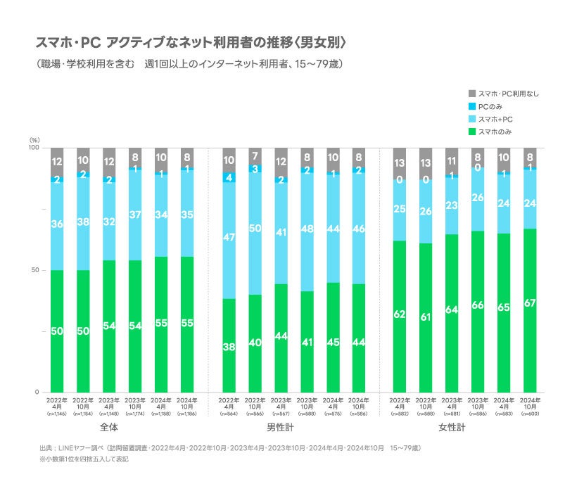 特に女性において「スマホのみ」比率が高い傾向が続いており、2024年10月は67%と過去最高を更新。