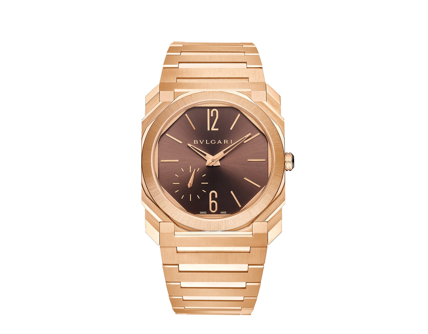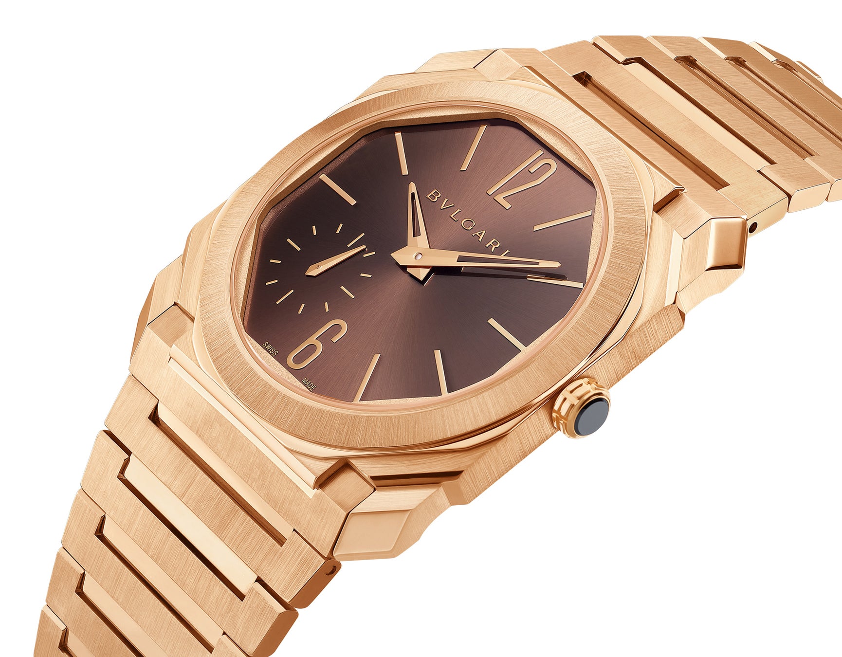 サテンブラッシュ加工のローズゴールド製ケースと、落ち着きあるブラウンラッカー仕上げのダイヤルの組み合わせが極上の気品を放つ見事な製造技術は、厚さはわずか3.3mmという世界最薄記録を樹立した、2019年登場の歴史的な自動巻きGMTクロノグラフをプレシャスに再解釈したものです。見ただけでそれとわかる、「オクト フィニッシモ」コレクションのシグネチャーと言える直径43mm超薄型8角形のケースは、サテンブラッシュ加工のローズゴールド製。100mの防水性を備えています。フォールディングバックルをセットしたブラウンのアリゲーターストラップが付属し、ケースの両サイドにあるプッシャーで操作するクロノグラフとGMT機能は、自社製自動巻きムーブメントBVLキャリバー318で駆動されます。気品とさりげない洗練さ人目を引く極薄のローズゴールド製ケースを採用したGMTクロノグラフは、現在も最も薄型の機械式クロノグラフです。