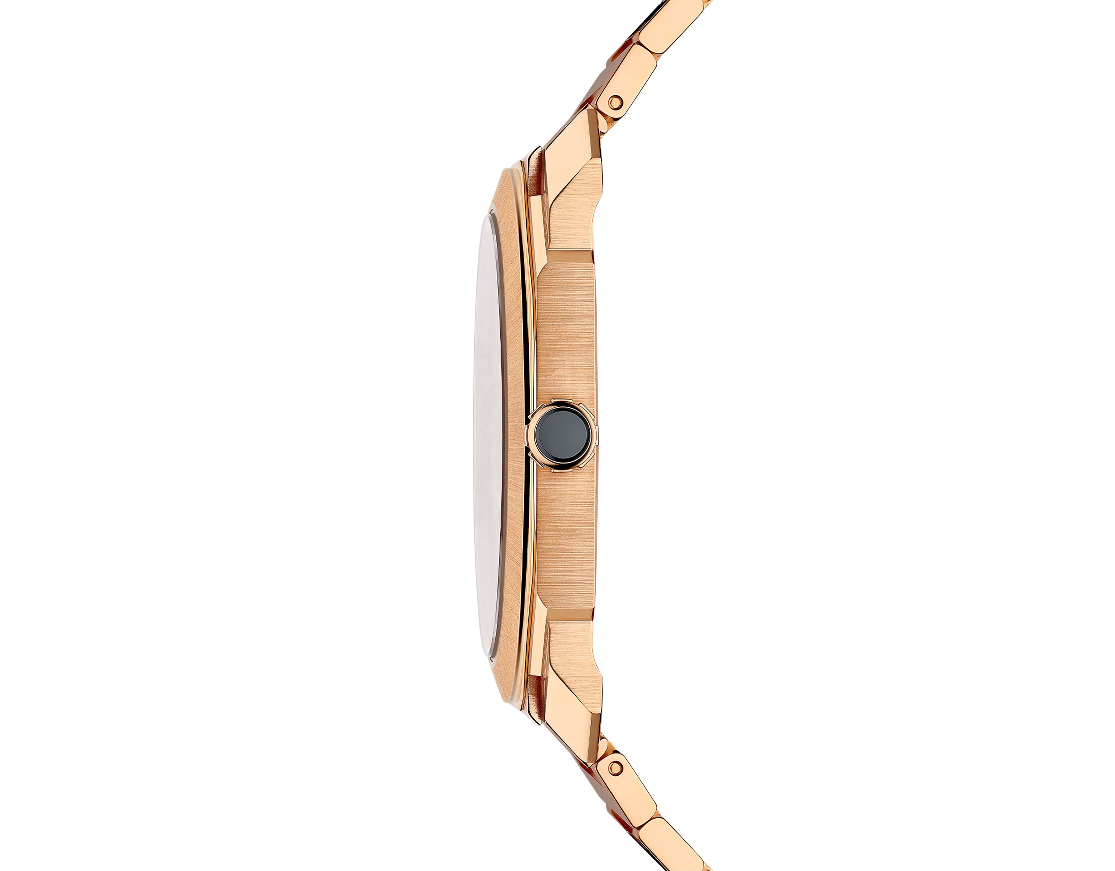 「オクト フィニッシモ」コレクションのシグネチャーを成す、洗練さと個性。今回展開するゴールドを纏った「オクト フィニッシモ オートマティック」には、この2つの要素が凝縮されています。ローズゴールドの輝きと、ブラウンラッカー仕上げのダイヤルとのコントラストが、このモデルに力強いキャラクターを与えています。また、ケースとブレスレットに施したマット加工とポリッシュ加工のコントラストは、このコレクションで初めて採用されたもの。「オクト フィニッシモ」コレクションのサーガに新たな一ページを加えます。