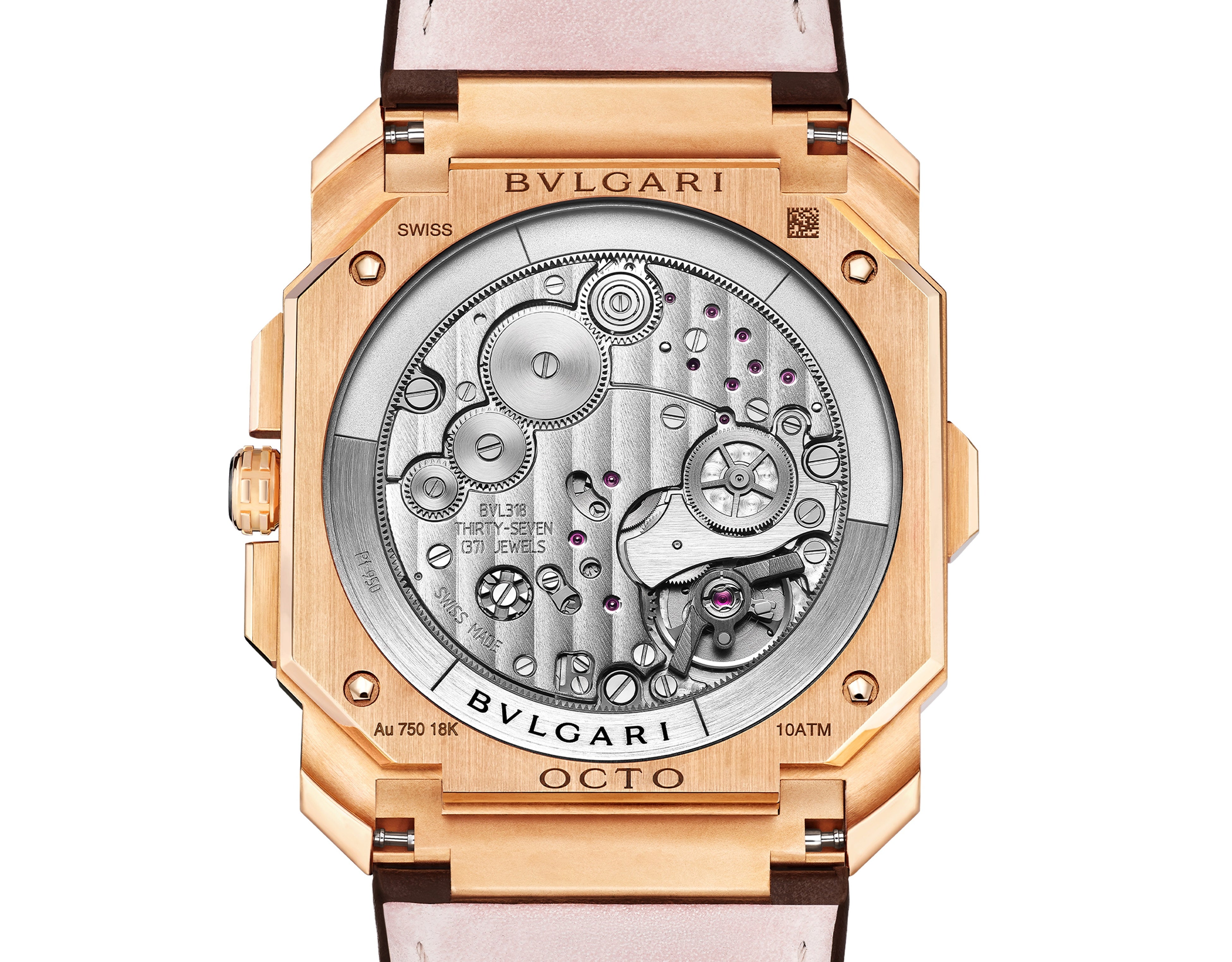 アップデートされた自動巻きマニュファクチュールムーブメントBVLキャリバー138が時を刻み、208個の部品と31の石数、2.23mmという記録的な薄さはそのままに、新しい自動巻き機構を搭載したクローズドバレルを導入しました。脱進機とテンプの部分にも新しい構造が適用されました。