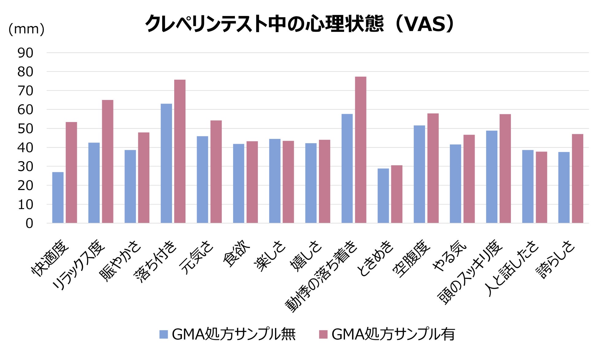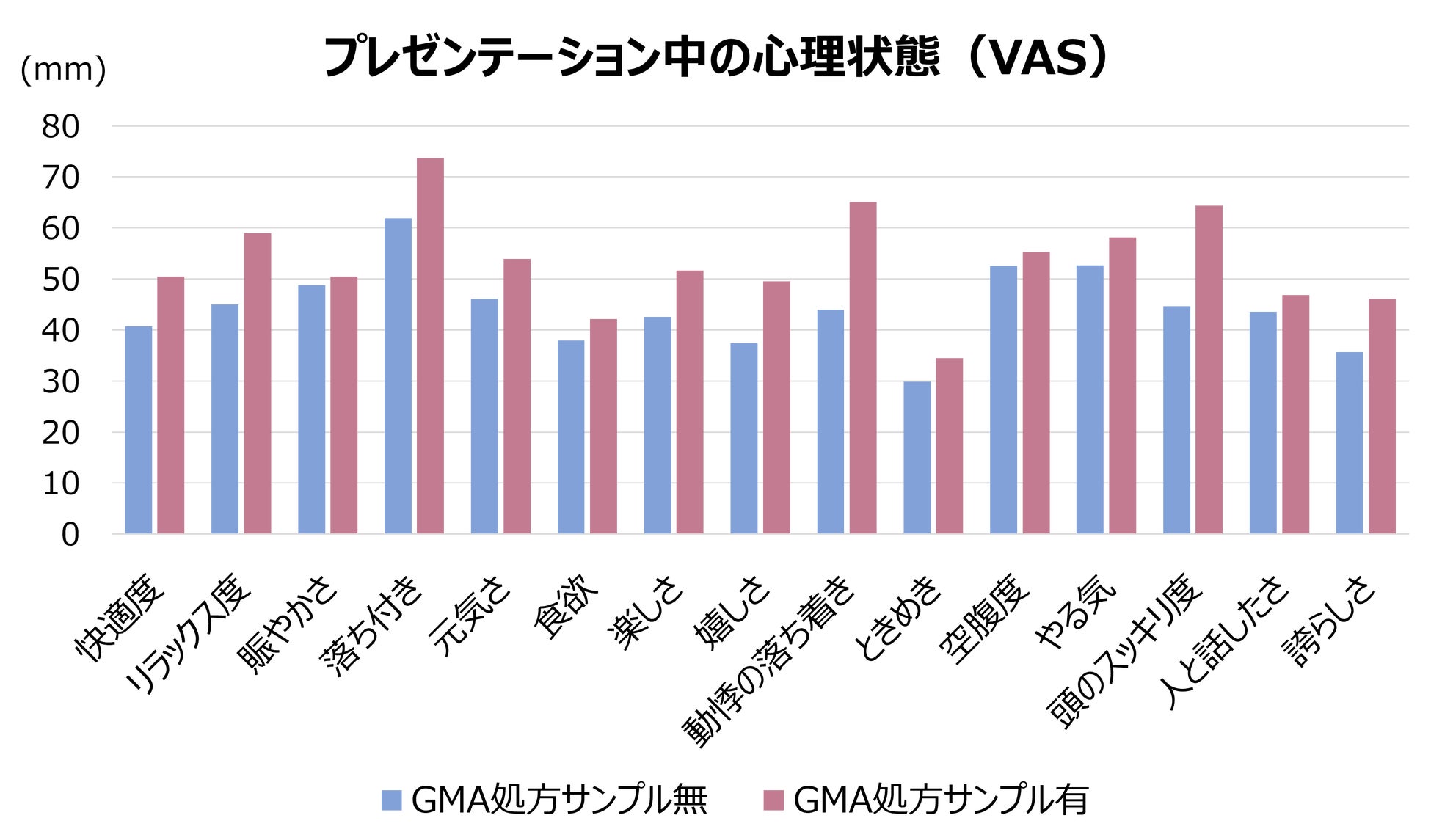 GMA処方サンプル塗布時は、非塗布時と比較して、プレゼンテーションの場合もクレペリン検査(変法)の場合も、快適度、リラックス度、スッキリ度、元気度、やる気度など、ほとんどの項目においてより高い評価が得られました。