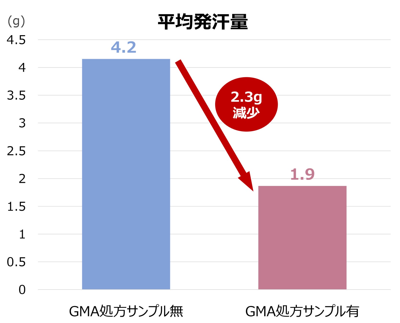 また、2023年の研究発表※4で証明されたとおり、GMA処方サンプル使用時と、非塗布時におけるTシャツの重量変化および汗染みを比較した結果、非塗布時の平均発汗量は約4.2gであったのに対し、GMA処方サンプル塗布時の平均発汗量は約1.9gであり、GMA処方サンプルの発汗抑制効果が認められました。