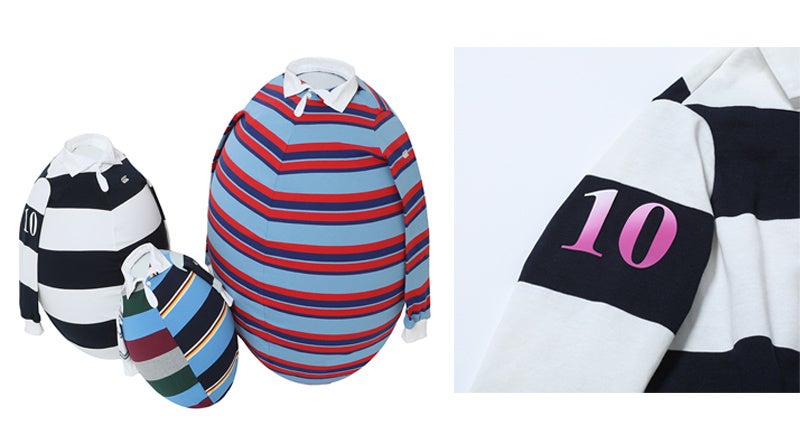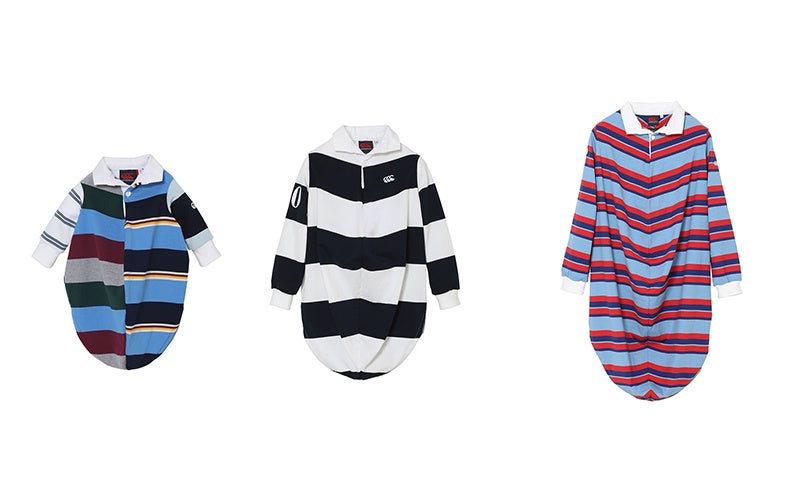 CANTERBURY ✕ ANREALAGE 仲間と情熱を共有する喜びを大切にするラグビーから着想を得て、性差や年齢、体型差といった壁を越え、誰もが等しく着用できる服としてANREALAGEがデザインしたラグビーボールの形の服。CANTERBURYの代名詞である伝統のラグビージャージーをベースとし、素材には生産過程の残反を利用しています。太陽光に反応して炎のように変色する特殊プリントでナンバーを入れています。