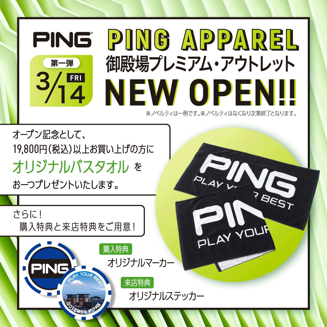 オープン記念として店舗来場者には先着にてオリジナルステッカーを、購入特典としてオリジナルマーカーをプレゼントいたします。またPING APPARELを19,800円(税込)以上お買い上げの方に先着順でPINGオリジナルバスタオルをプレゼントいたします。