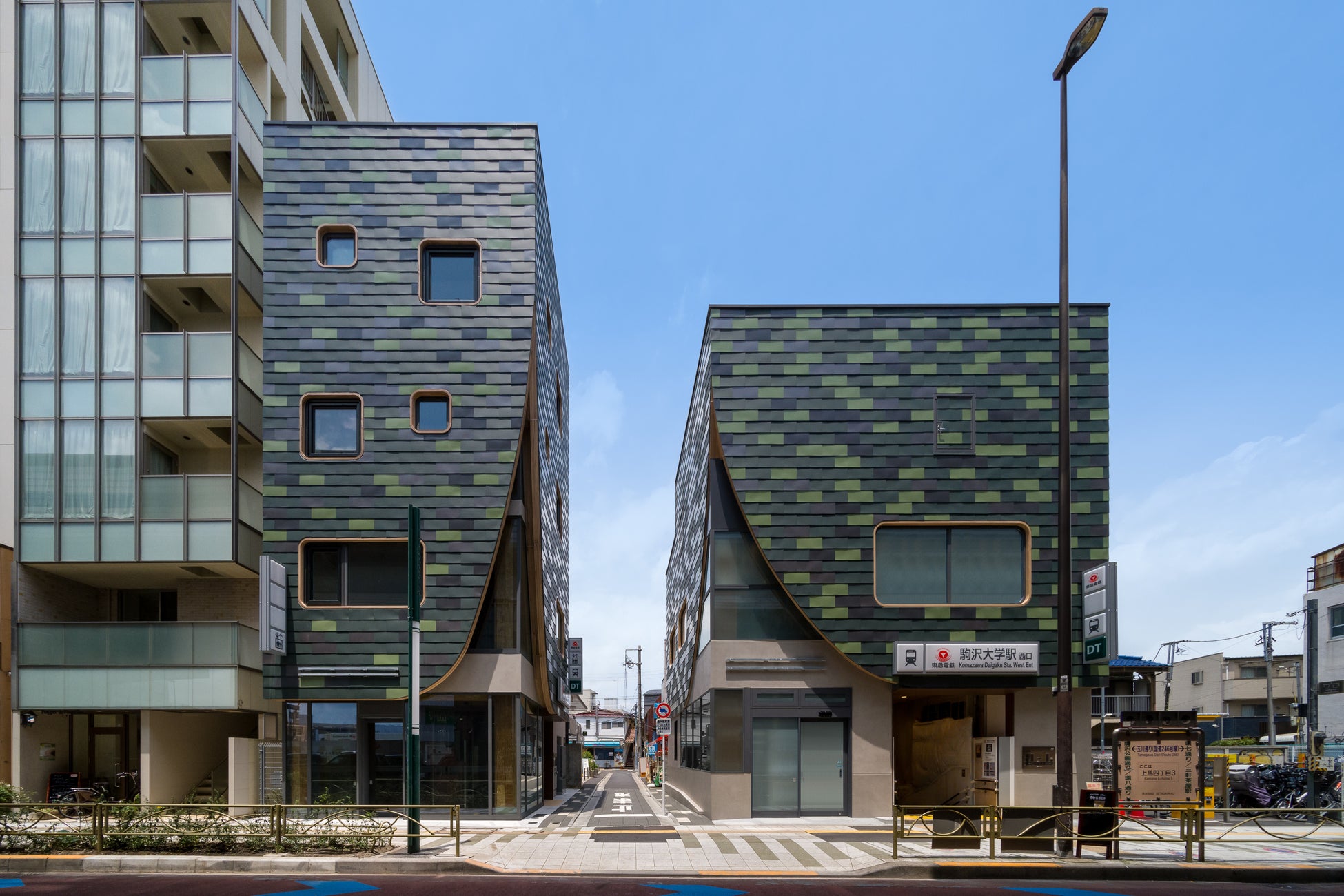 駒沢大学駅西口には、地下から伸びる木に茂る葉をイメージした外装の2棟のビルが新たに誕生します。駒沢大学駅の新たなバリアフリールートとなった全国初の耐火・構造技術を導入した4階建ての木造ビル「(仮称)駒沢大学駅西口ビル(2)」の地下1階には、「三菱UFJ銀行ATM」が出店し、駅利用者の利便性向上を目指し、また隣の「(仮称)駒沢大学駅西口ビル(1)」には新たなティーカルチャーの創造と定着を目指し、多くのお客さまに親しまれている「ゴンチャ(Gong cha)」が出店し、お客さま一人ひとりの好みに合ったお茶をご用意します。2022年8月に先行開業した「ドトールコーヒーショップ」が出店する東口ビルと合わせ、3本の木をイメージしたビルが駒沢大学駅の新たなシンボルとなり、駅・まち・人をつなぎ、街の賑わいを創出することを目指します。