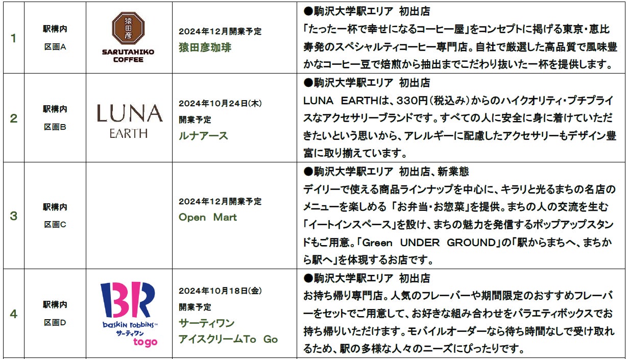 駅構内には、駒沢大学駅周辺に店舗を構える地元店とコラボレーションしたお弁当やお惣菜を販売する日常使いに最適な新たなコンビニエンスストア「Open Mart」や、「たった一杯で幸せになるコーヒー屋」をコンセプトに掲げるスペシャルティコーヒー専門店「猿田彦珈琲」、ハイクオリティでありながらプチプライスなアクセサリーショップ「LUNA EARTH(ルナアース)」、毎日違ったフレーバーを楽しめるアイスクリームショップ「サーティワン アイスクリーム To Go」が出店します。