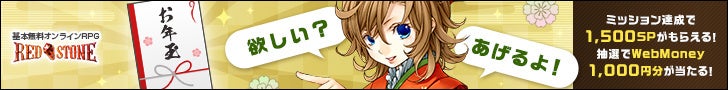 また、「お年玉ミッション」は、ミッション内容を変更し、ミッションクリアで1,500円相当のサービスポイントがもらえるほか、WebMoney1,000円分が抽選で当たる第二弾がスタートいたしました。さらに、『RED STONE』の思い出やあるあるを"五・七・五”で投稿し、入選すると10,000円分のWebMoneyがもらえるイベント「RED STONEの思い出575」も新たに開始いたしました。