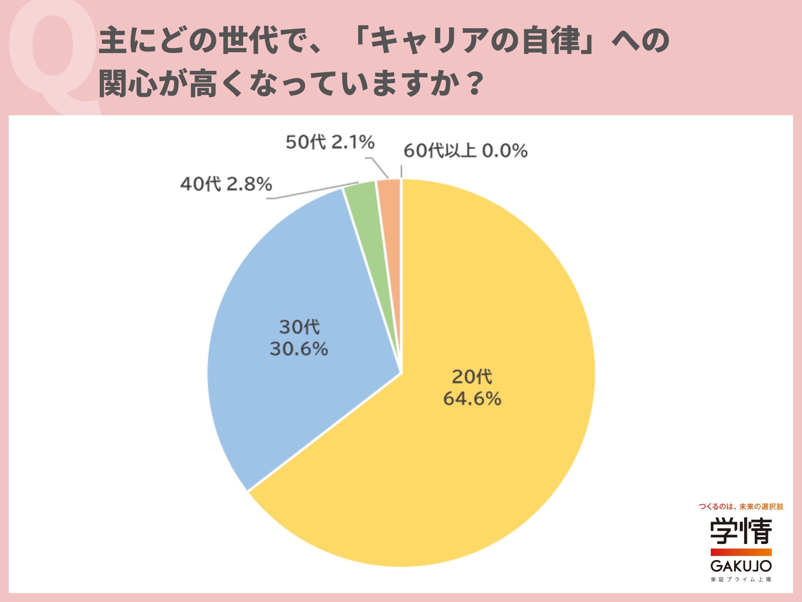「キャリアの自律」への関心が高くなっている世代は、「20代」が64.6%で最多。次いで「30代」30.6%が続きました。「20代」「30代」で95.2%を占め、主に若い世代で「キャリアの自律」への関心が高くなっていることが分かります。