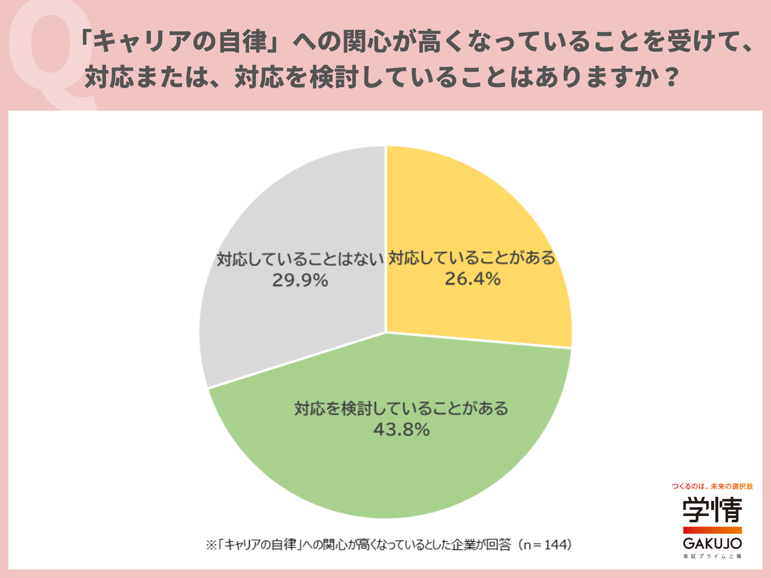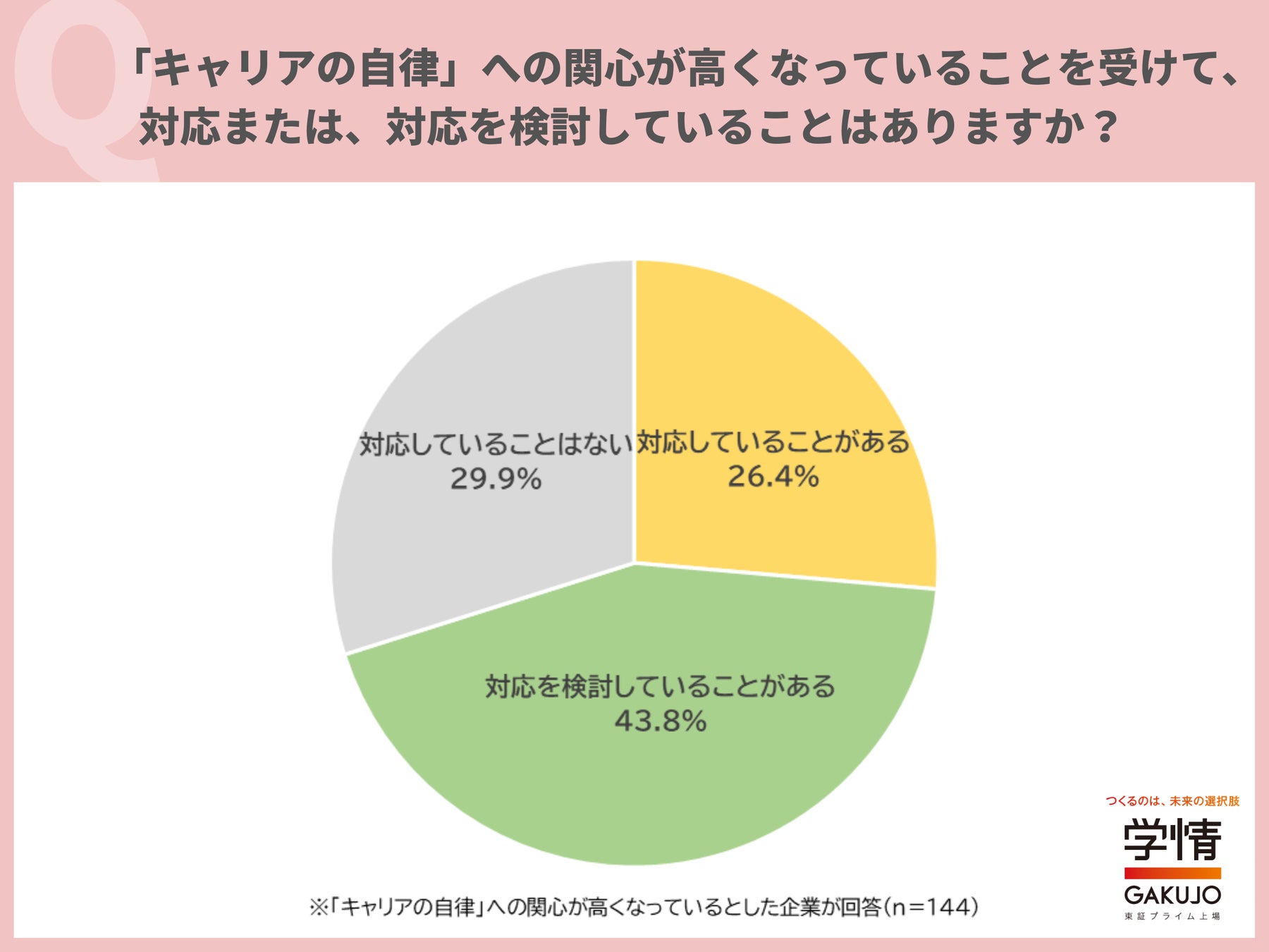 「キャリアの自律」への関心が高くなっていることを受けて、「対応している」と回答した企業は26.4%でした。4社に1社は、「キャリアの自律」への関心が高くなっていることを受けて、対応を実施していることが分かります。「対応を検討している」と回答した企業は、43.8%となっています。
