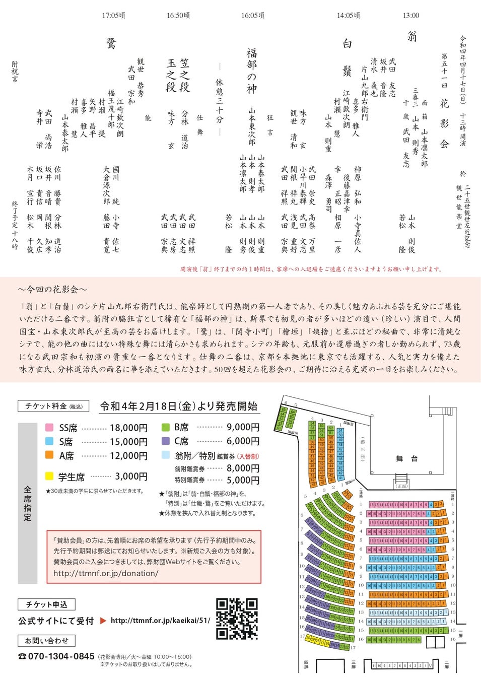 公益財団法人武田太加志記念能楽振興財団主催、『第51回花影会』が2022年4月17日 (日)に観世能楽堂(東京都中央区)にて上演されます。チケットはカンフェティ(運営:ロングランプランニング株式会社、東京都新宿区、代表取締役:榑松 大剛)にて発売中です。