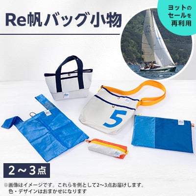 「Re帆バッグ」シリーズの小サイズ・サコッシュ・エコバッグ・ポーチ・ペンケースなどのアイテムから、お任せで2~3点を詰め合わせたセットが届きます。