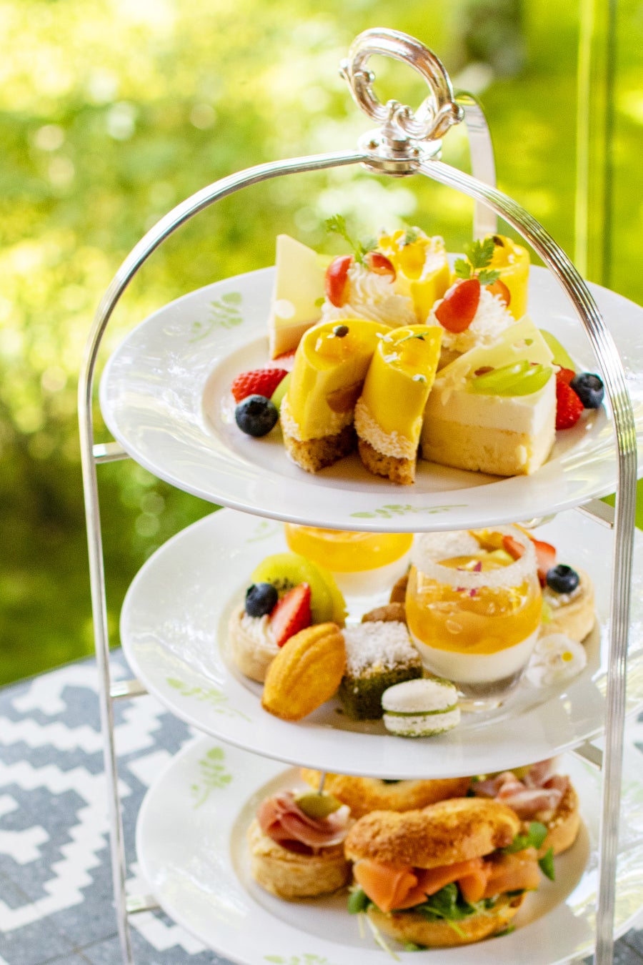 小鳥も啄みたくなるほどの瑞々しいチェリーに積もるかき氷は甘酸っぱいライチ味。木々の緑に映えて輝くエキゾチックな夏色マンゴーとパッションフルーツのムース、その甘い香りに動物たちもつられて顔を出しそうなジューシーな白桃を存分に味わえるムースとコンポートなど、今が旬のフルーツが勢ぞろい。どれも主役級のデザートたちを森の⽊々のように⾼く仕上げた華やかな3段スタンドに詰め込みました。