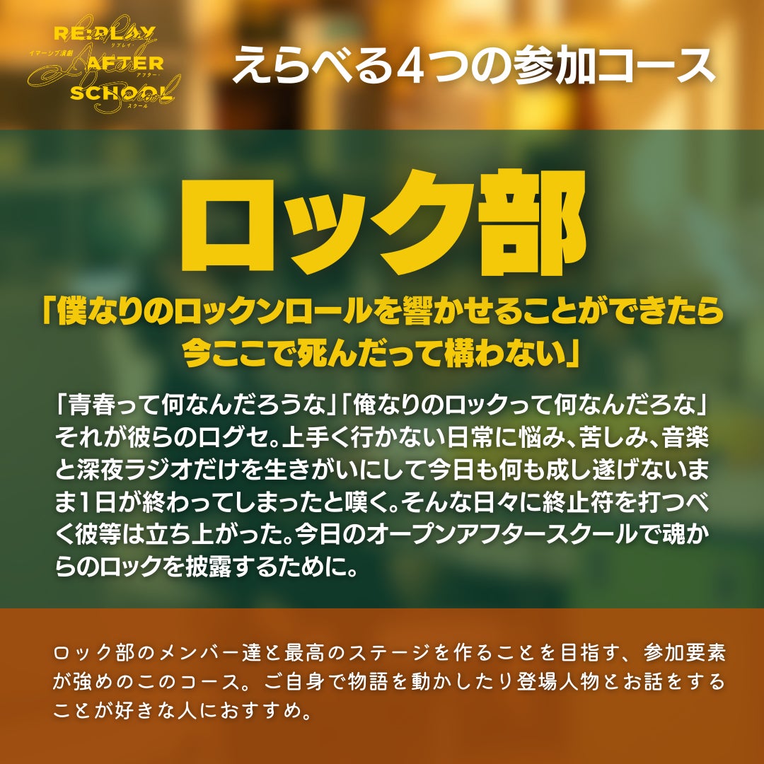 ▼ロック部のメンバー達と最高のステージを作ることを目指す、参加要素が強めのこのコース。ご自身で物語を動かしたり登場人物とお話をすることが好きな人におすすめ。