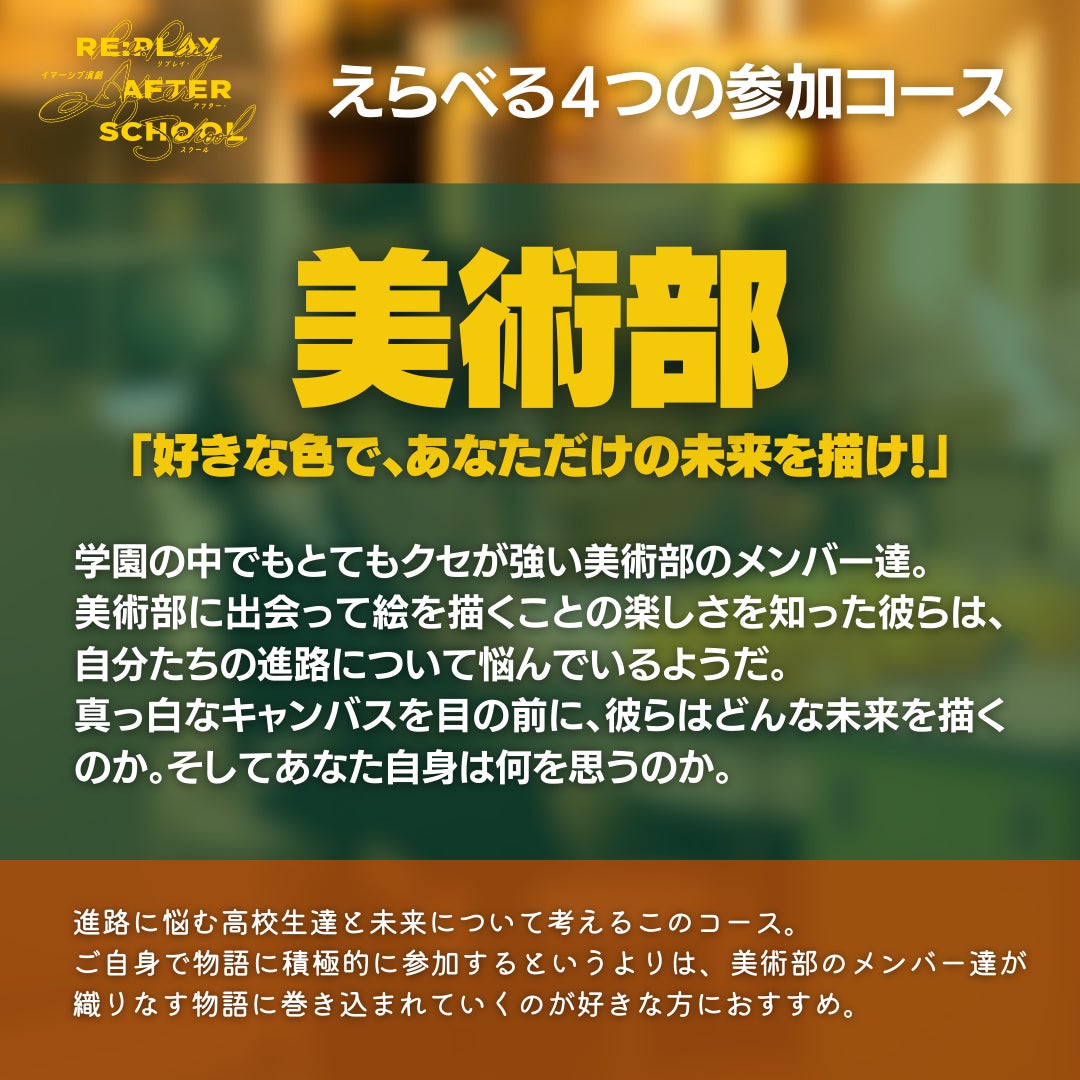 ▼進路に悩む高校生達と未来について考えるこのコース。ご自身で物語に積極的に参加するというよりは、美術部のメンバー達が織りなす物語に巻き込まれていくのが好きな方におすすめ。