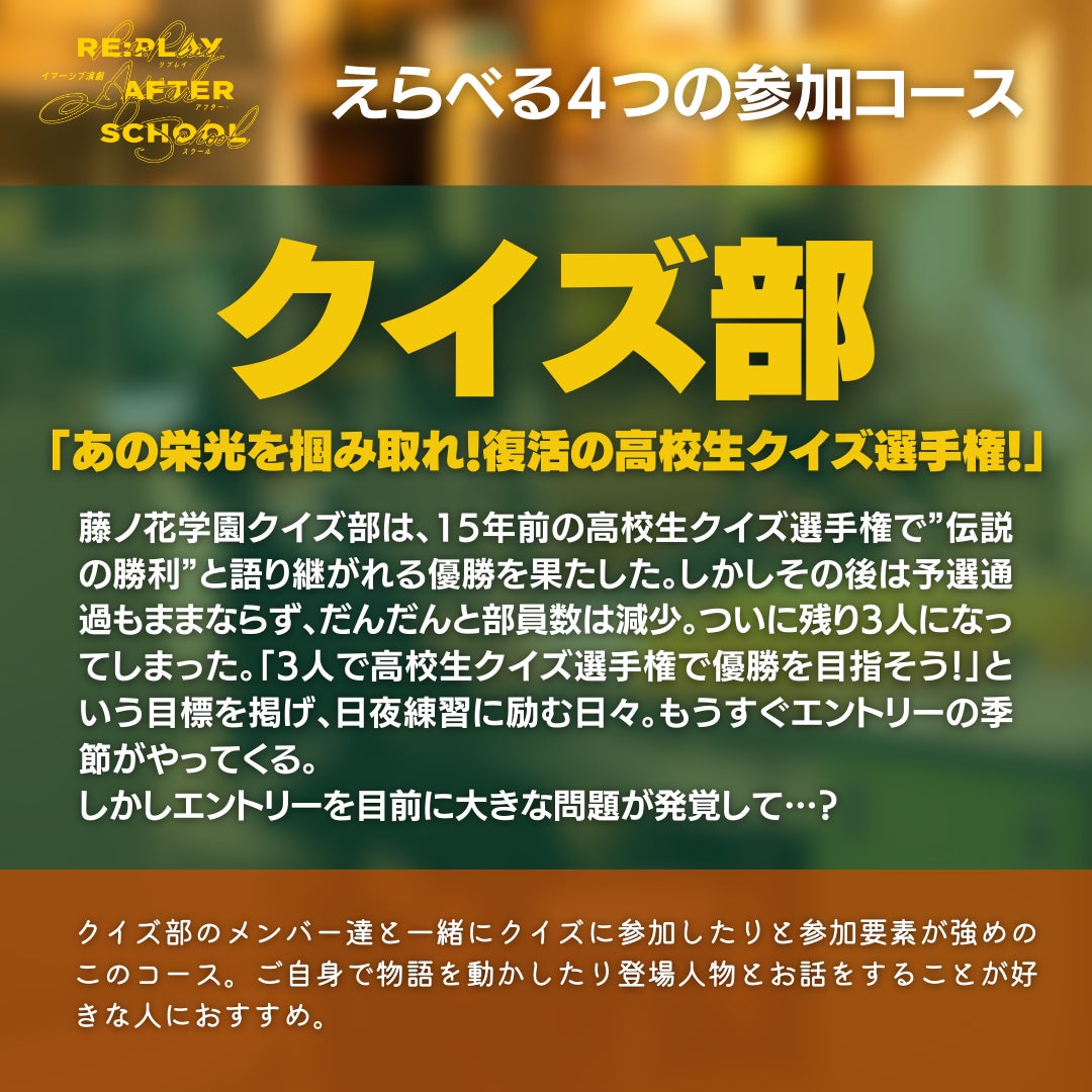 ▼クイズ部のメンバー達と一緒にクイズに参加したりと参加要素が強めのこのコース。ご自身で物語を動かしたり登場人物とお話をすることが好きな人におすすめ。
