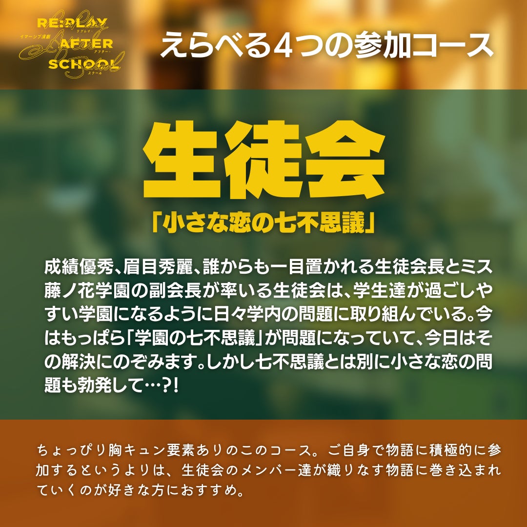 ▼ちょっぴり胸キュン要素ありのこのコース。ご自身で物語に積極的に参加するというよりは、生徒会のメンバー達が織りなす物語に巻き込まれていくのが好きな方におすすめ。