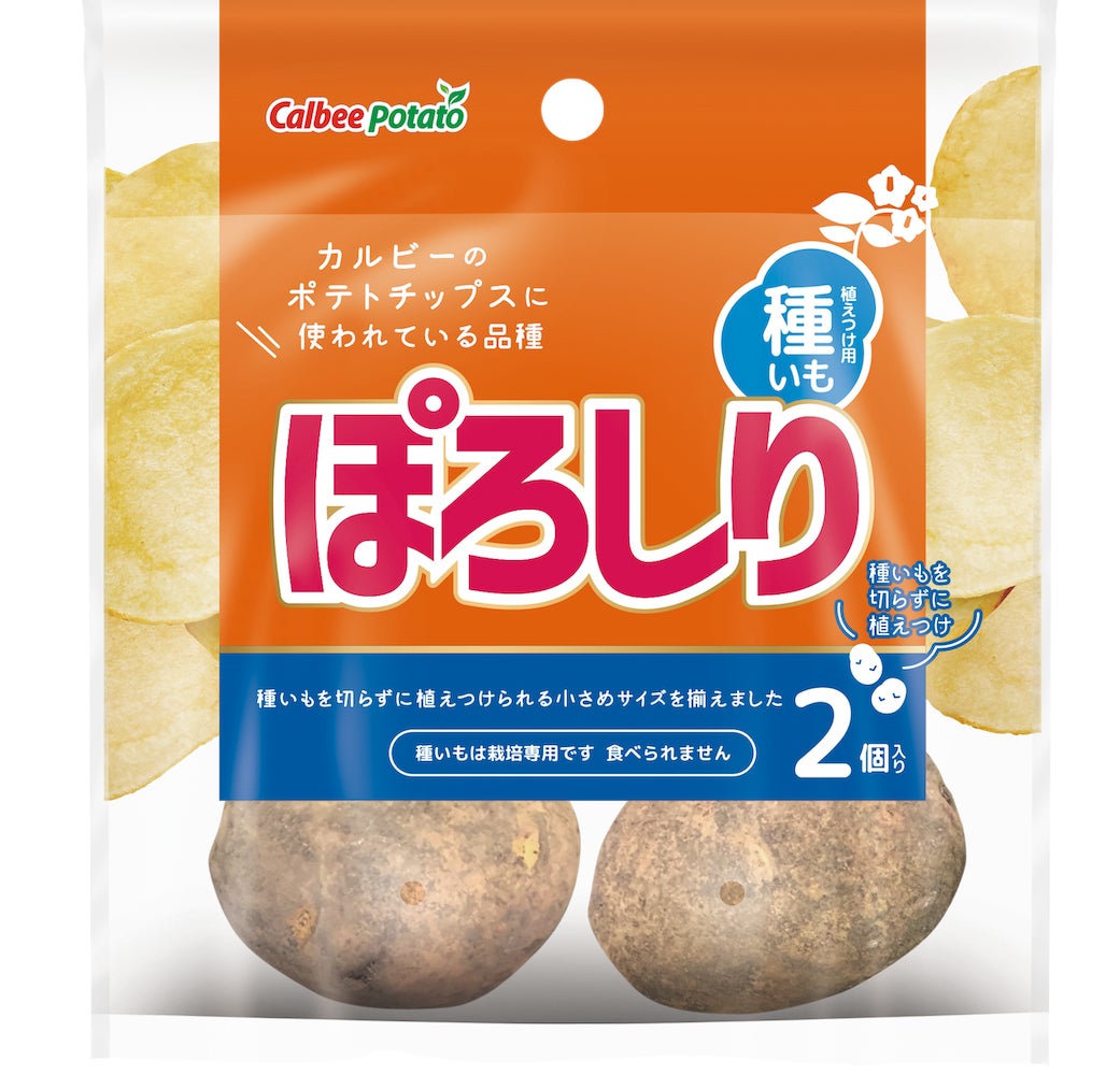 栽培用種芋『ぽろしり』は、カルビーポテトが10年以上かけて開発したオリジナルのじゃがいも品種です。切らずにそのまま植えつけるのに適したサイズを揃えました。カルビーポテトではこの商品で初めてホームセンターでの販売に取り組みます。