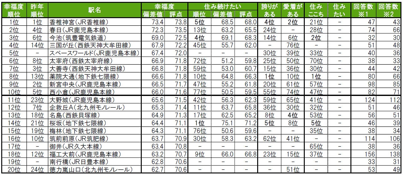 1位は2年連続で福岡市東区に位置する香椎神宮で、「街に愛着がある」2位、「街に誇りがある」4位、「住み続けたい街」5位となっています。2位は、春日市に位置する春日が昨年4位から順位を上げました。トップ2の駅は、偏差値70台の極めて高い評価を得ています。3位は北九州市八幡西区に位置する今池で、「住みここち」は2位、「住み続けたい街」は4位となっています。
