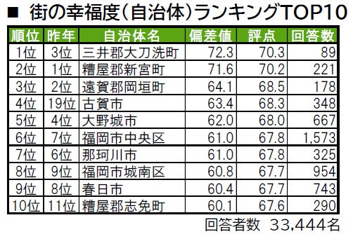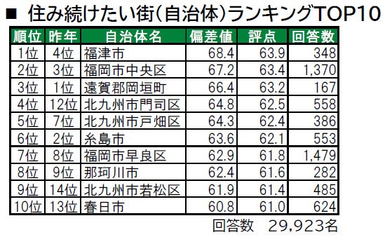 1位は、昨年3位だった三井郡大刀洗町で、偏差値70台の極めて高い評価を得ています。2位は糟屋郡新宮町で、「街に誇りがある」でも2位で、1位の大刀洗町と同様に偏差値70台の極めて高い評価を得ています。3位は遠賀郡岡垣町で、「住み続けたい街」でも3位となっています。