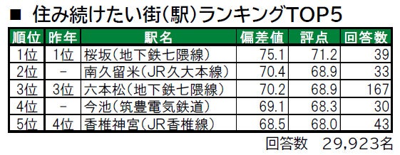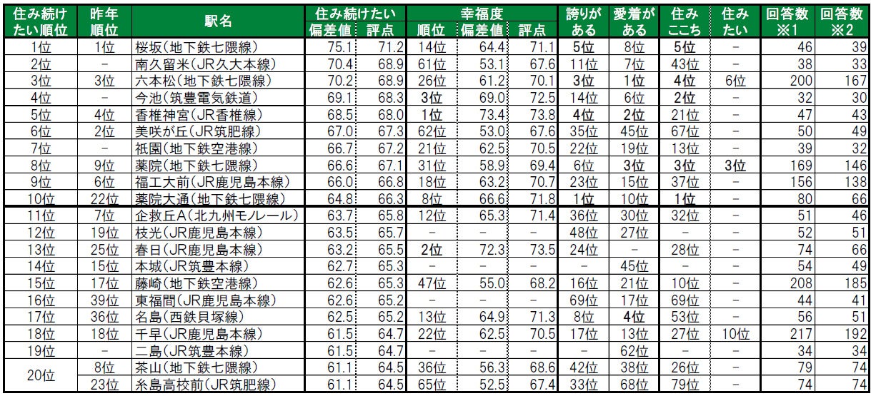 1位は2年連続で桜坂で、「住みここち」「街に誇りがある」では5位となっています。2位は久留米市に位置する南久留米で、昨年は累計回答数が30名未満でランキング集計対象外でした。3位は2年連続で六本松で、「街に愛着がある」1位、「街に誇りがある」3位、「住みここち」4位となっています。1位の桜坂と3位の六本松は、「住み続けたい街(自治体)」で2位の福岡市中央区に位置する駅です。