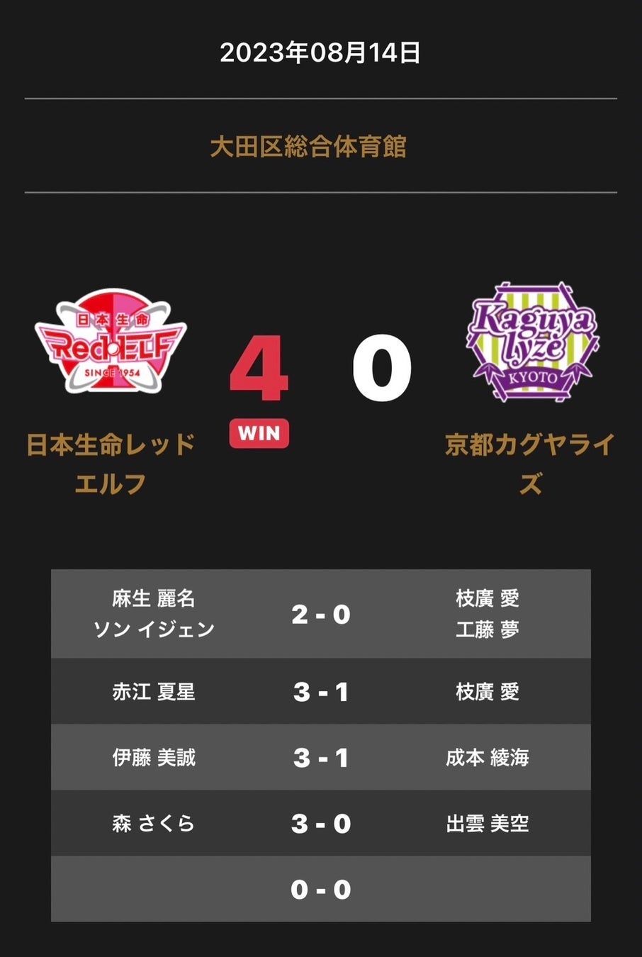日本生命レッドエルフと京都カグヤライズの試合は、4-0で日本生命レッドエルフが勝利しました。