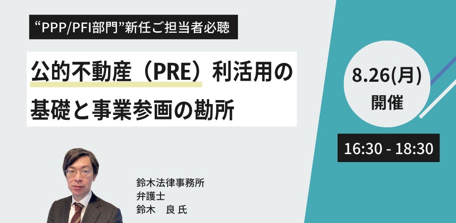 JPI(日本計画研究所)は、鈴木法律事務所 弁護士 鈴木 良 氏を招聘し、公的不動産(PRE)利活用の基礎と事業参画の勘所について詳説いただくセミナーを開催します。