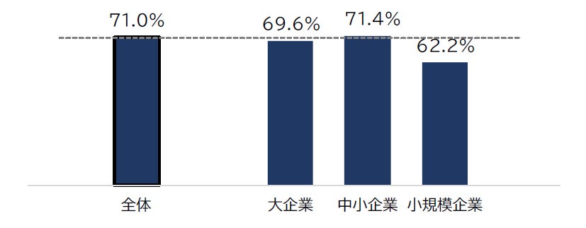 「初任給を引き上げる」と回答した企業の割合を規模別にみると、「中小企業」は71.4%で、「大企業」(69.6%)よりも高くなった。一方で、「小規模企業」は62.2%と全体を8.8ポイント下回り、規模間で格差がみられた。