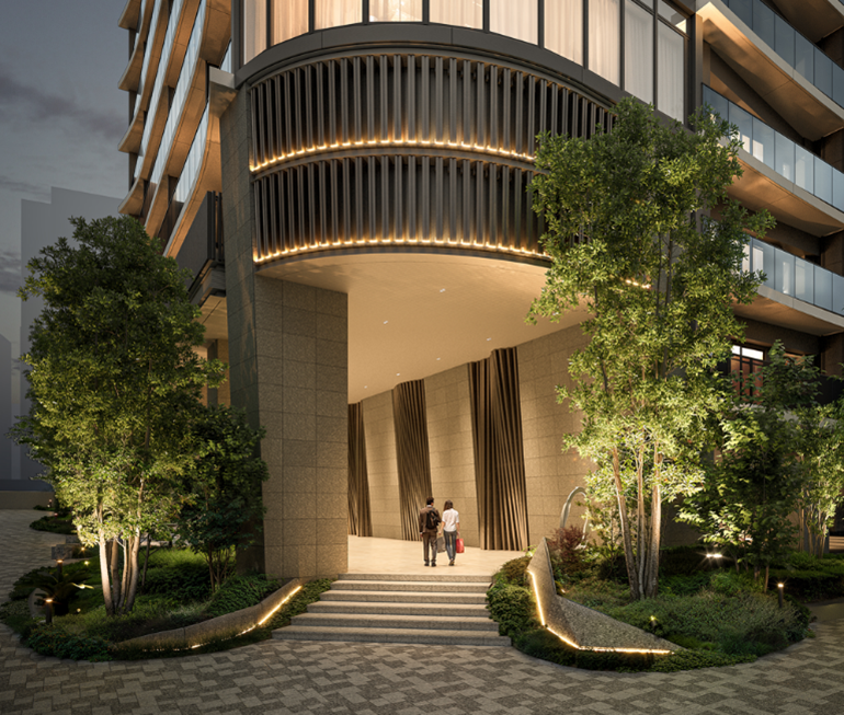 ※掲載の各完成予想 CG は計画段階の図面を基に描き起こしたものおよび周辺環境写真等を合成したもので建物の形状・色等は実際とは異なります。なお形状の細部、設備機器等は表現しておりません。表現されている植栽は初期の育成期間を経た状態のものを想定して描いており、竣工時は植物の育成を見込んで必要な間隔をとって植えております。施工上の都合により、設定位置・樹高・本数等変更となる場合があります。また、眺望の表現は眺望写真にCGを合成したもので、実際の住戸からの眺望と異なります。眺望・景観は各階・各住戸により異なり、今後の周辺環境の変化に伴い将来にわたって保証されるものではありません。