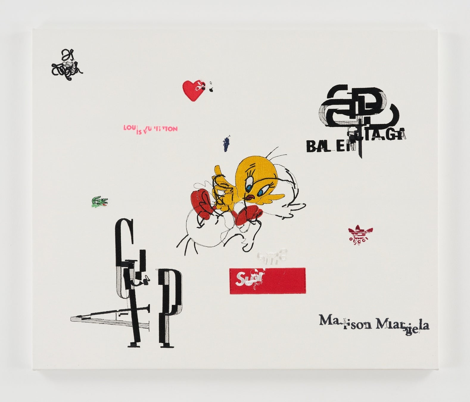 本展では、キービジュアルとなっているキャンバス作品のシリーズに加え、パーカーなどに刺繍を入れたグッズも展開します。