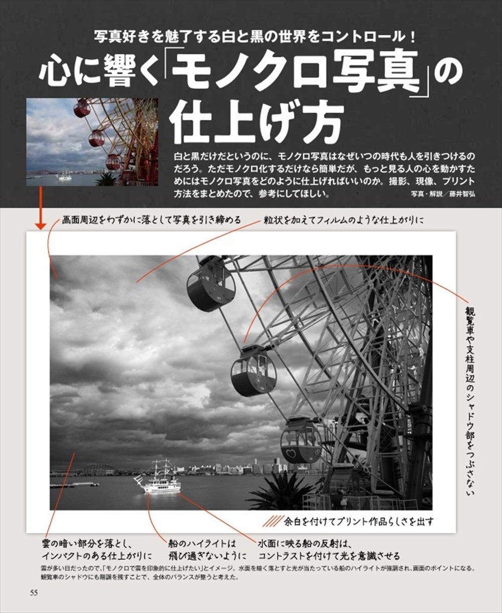 モノクロ写真はなぜいつの時代も人を引き付けるのでしょうか。デジタル画像では、カラー写真をモノクロ化するだけで誰でも簡単に作ることができるようになりました。しかし、見る人の心を動かす、魅了するモノクロ写真に仕上げるには、ただ撮るだけ、ただ変換するだけではダメ。ここではモノクロ写真に特化した撮影、現像、プリント方法を紹介します。