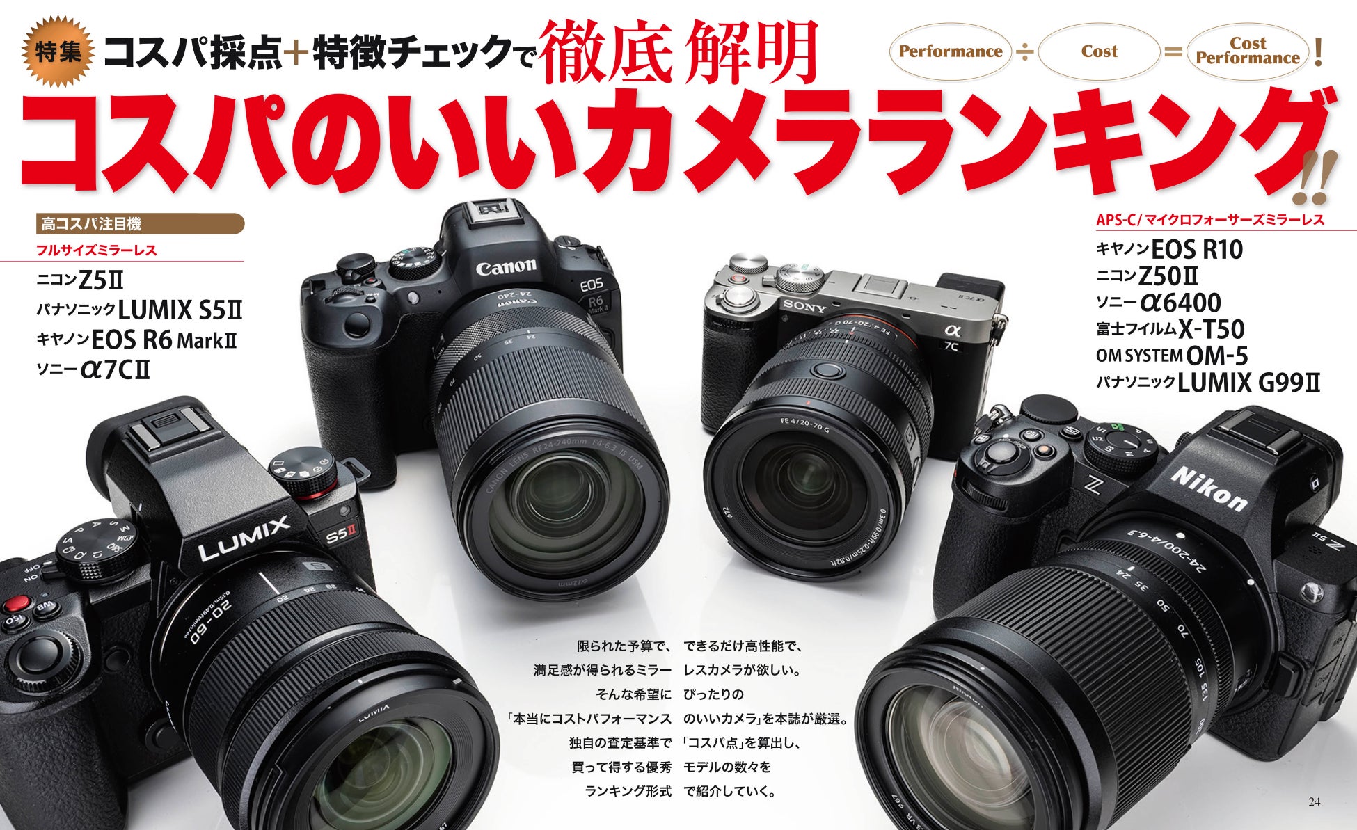 独自の査定基準「コスパ点」を算出し、買って得する優秀モデルの数々をランキング形式で紹介。高額製品の多いフルサイズミラーレスからは、ニコンZ5Ⅱ、パナソニックLUMIX S5Ⅱ、キヤノンEOS R6 MarkⅡ、ソニーα7CⅡがエントリー。APS-C/マイクロフォーサーズでは6モデルを比較検証します。