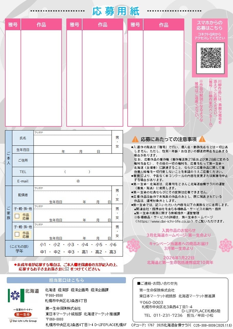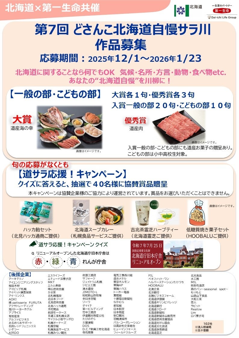 北海道と第一生命保険株式会社は、包括連携協定に基づく取組として、第一生命保険(株)が実施するサラ川こと「サラッと一句!わたしの川柳コンクール」の北海道版である「第7回どさんこ北海道自慢サラ川(川柳)」を実施し、北海道のPRにつながるユニ ークな作品を募集しております!