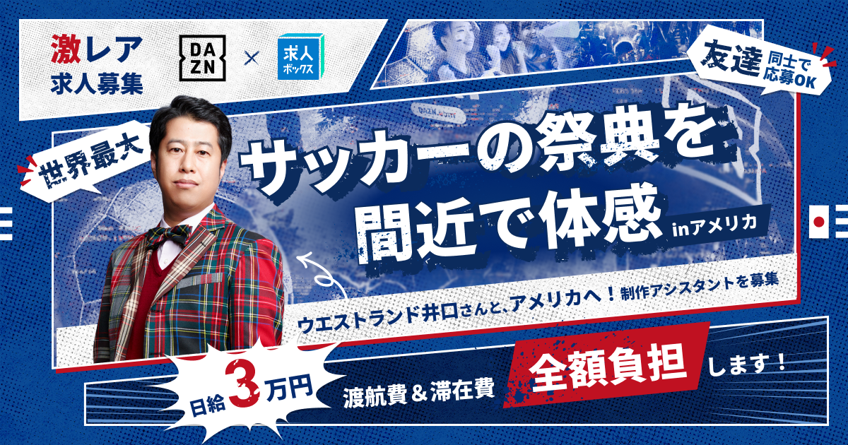 株式会社カカクコム(本社:東京都渋谷区 代表取締役社長:村上 敦浩)が運営する求人情報の一括検索サービス「求人ボックス」は、スポーツ配信サービス「DAZN(ダゾーン)」とコラボレーションし、お笑いコンビ ウエストランドの井口浩之さんが出演するSNS特別コンテンツの制作をサポートする「激レア求人」の募集を開始したことをお知らせします。