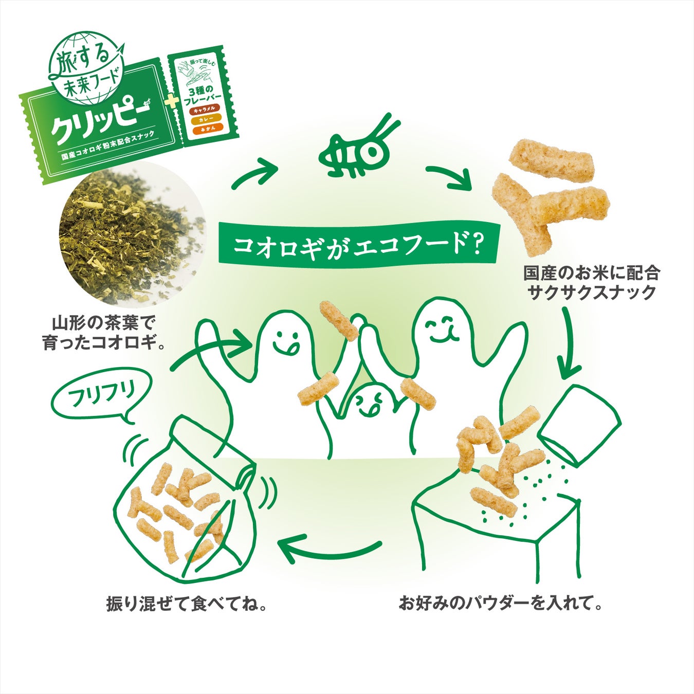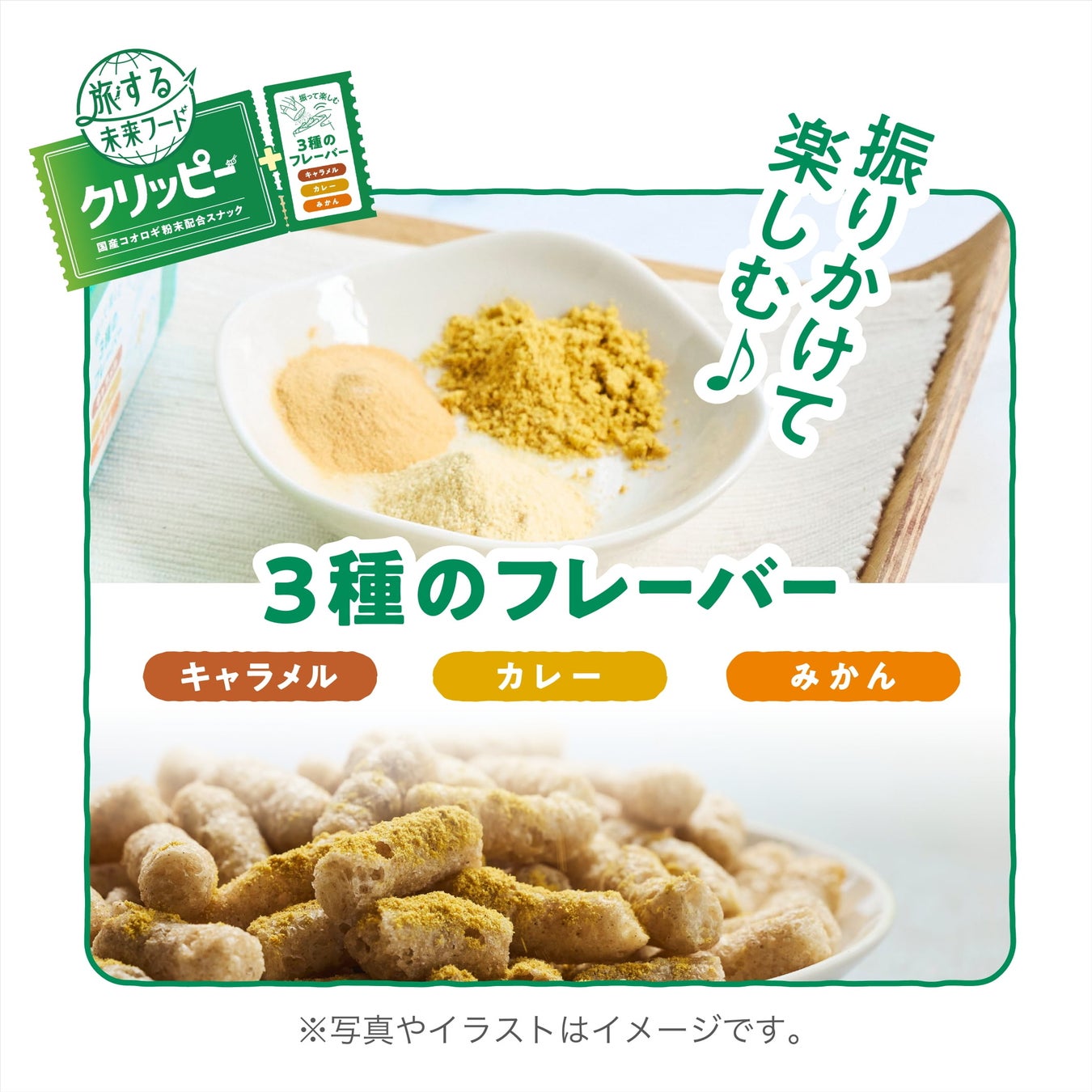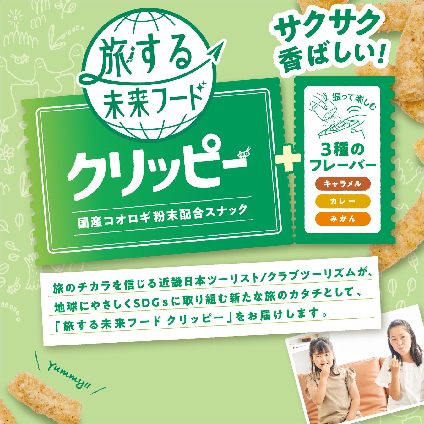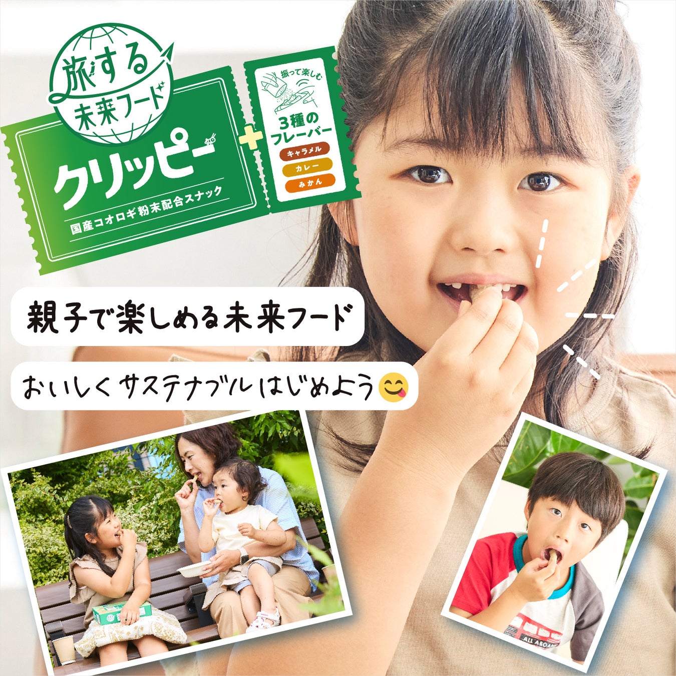 ”旅する未来フード クリッピー”は、未来の食の選択肢を増やすため、子どもの時から「昆虫=食べられるもの」であることを身近に感じてもらえるよう、親しみやすいスナック菓子に3種のフレーバー(キャラメル、カレー、ミカン)を用意し、親子で楽しみながらSDGsについて考えるきっかけとなる工夫を施しています。