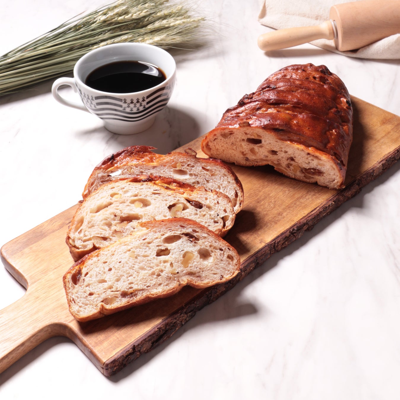 卵白と牛乳を使い、ふんわりと仕上げた生地に2種類のラムレーズンとクルミを入れて焼き上げました。