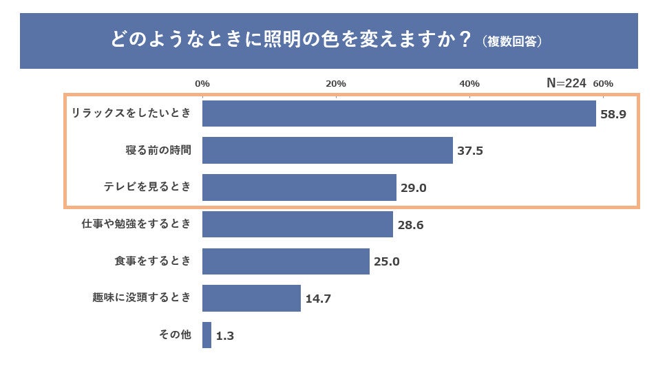・照明の色を変えたいときは「リラックスをしたいとき」が58.9%で1位に