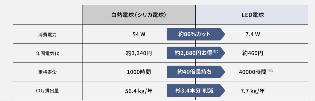 ※2 当社LED電球LDA7L-D-G/S/Z6/F(定格消費電力7.4W、定格寿命40000時間)とJIS規格一般照明用白熱電球60形(定格消費電力54W、定格寿命1000時間)との比較。1日5.5時間、年間2,000時間点灯、使用電力料金(目安単価)31円/kWh(税込)[2022年7月改定]で計算。当社調べ。使用条件により変わることがあります。