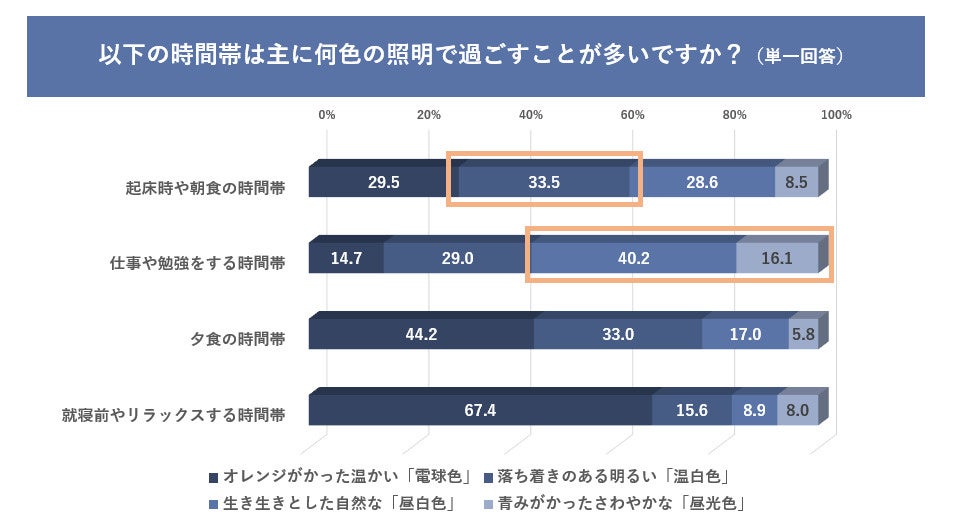 夕食時や就寝前のリラックスタイムはオレンジがかった温かい「電球色」が最多に