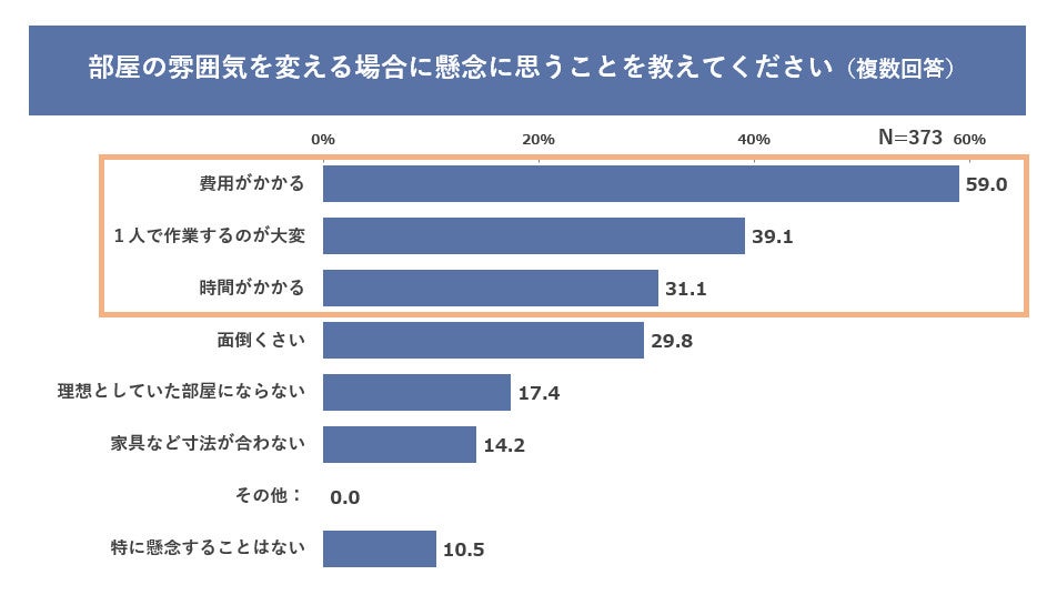 ・部屋の雰囲気を変えたくなる一方で、模様替えはインテリアの購入などに「費用がかかる」ことを懸念に感じる人が59%と多数