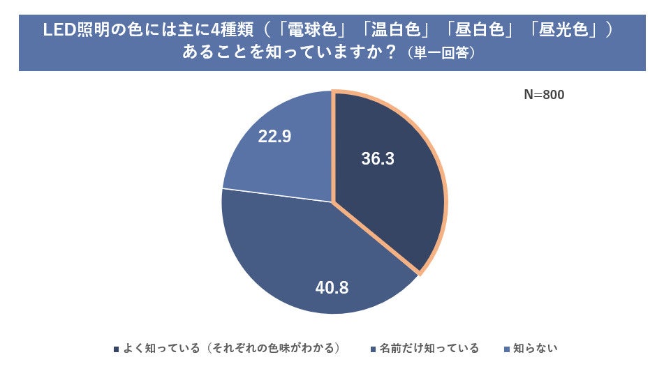 LED照明には、調光・調色機能が搭載されているものが多くありますが、その色の種類について知っているかを聞いてみました。色には主に4種類(「電球色」「温白色」「昼白色」「昼光色」)あることを知っているかどうかを聞いたところ、「よく知っている」と回答した人は36.3%であかりの色の違いを認識している人は3人に1人という結果になりました。「名前だけ知っている」と「知らない」を合わせると6割以上の方が色の違いについては認識しておらず、具体的な色の種類や特徴についてはまだまだ知らない人が多いことがうかがえます。