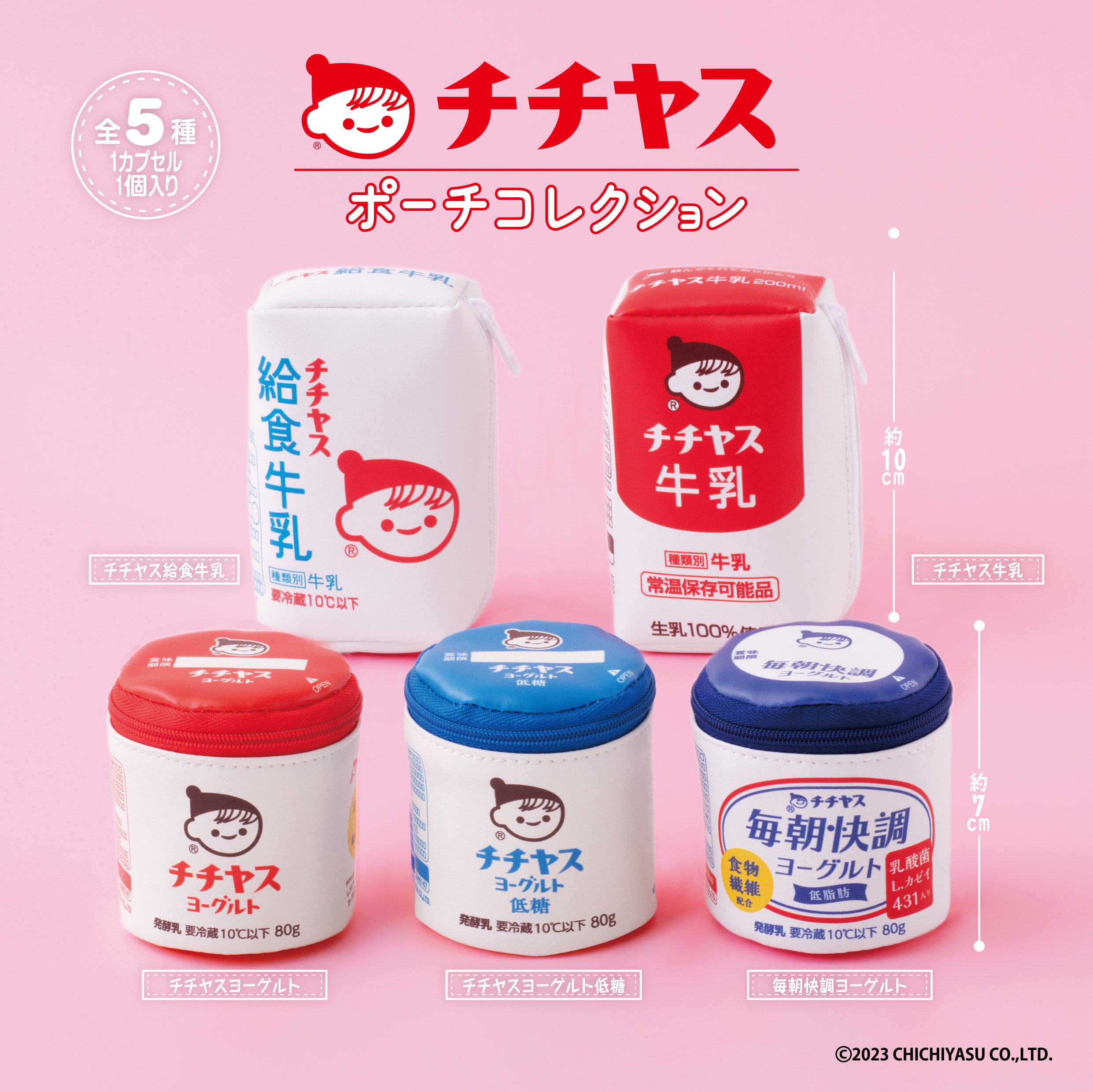 ガシャポン初のチチヤスグッズです。ヨーグルトや飲料のパッケージデザインが、そのままポーチになりました! 価格:400円/1回(全5種) ©2023 CHICHIYASU CO.,LTD. |