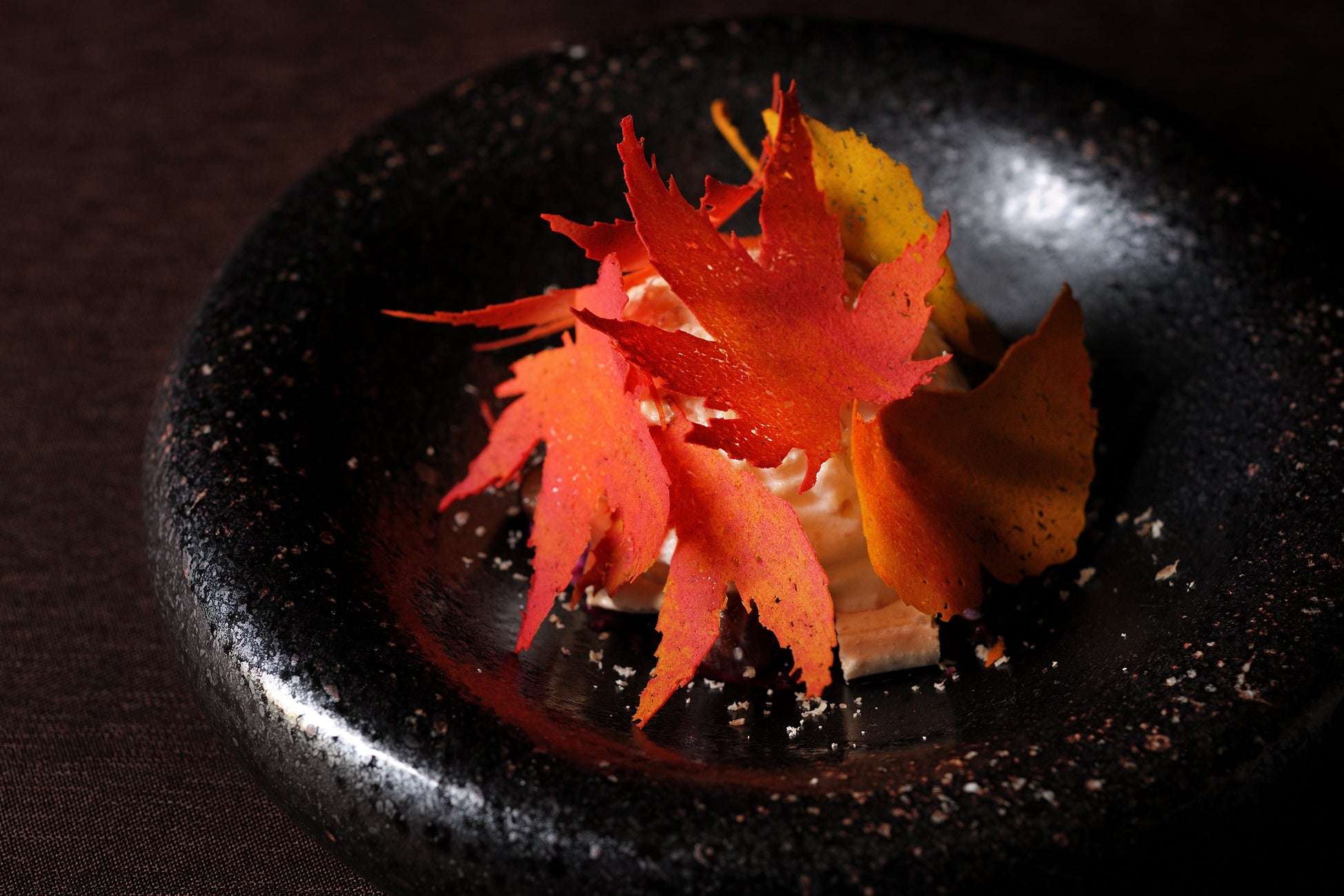 ビーツのピュレと栗に、スモークした芳ばしいクリームを合わせ、モンテビアンコ(*4)に仕立てました。栗のほくほくとした食感とビーツのほんのりとした甘さが、クリームの香りと相性の良い一皿です。紅葉とイチョウを形どった栗のクロッカンテ(*5)を添え、見た目からも秋を存分に感じられます。
