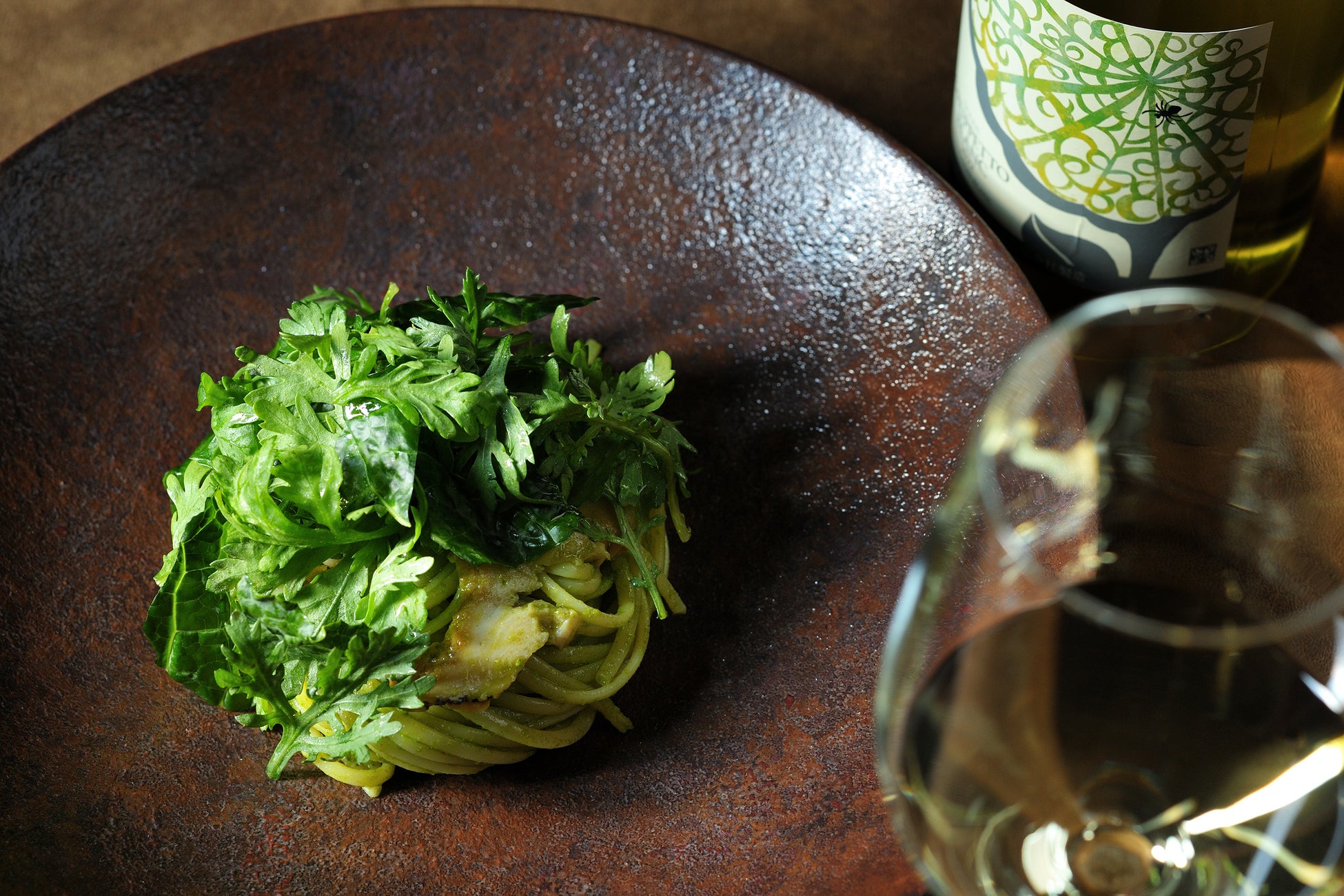 春菊とカーボロネロのリングイネ × グルペット・ブラン(旭洋酒/山梨県山梨市)
