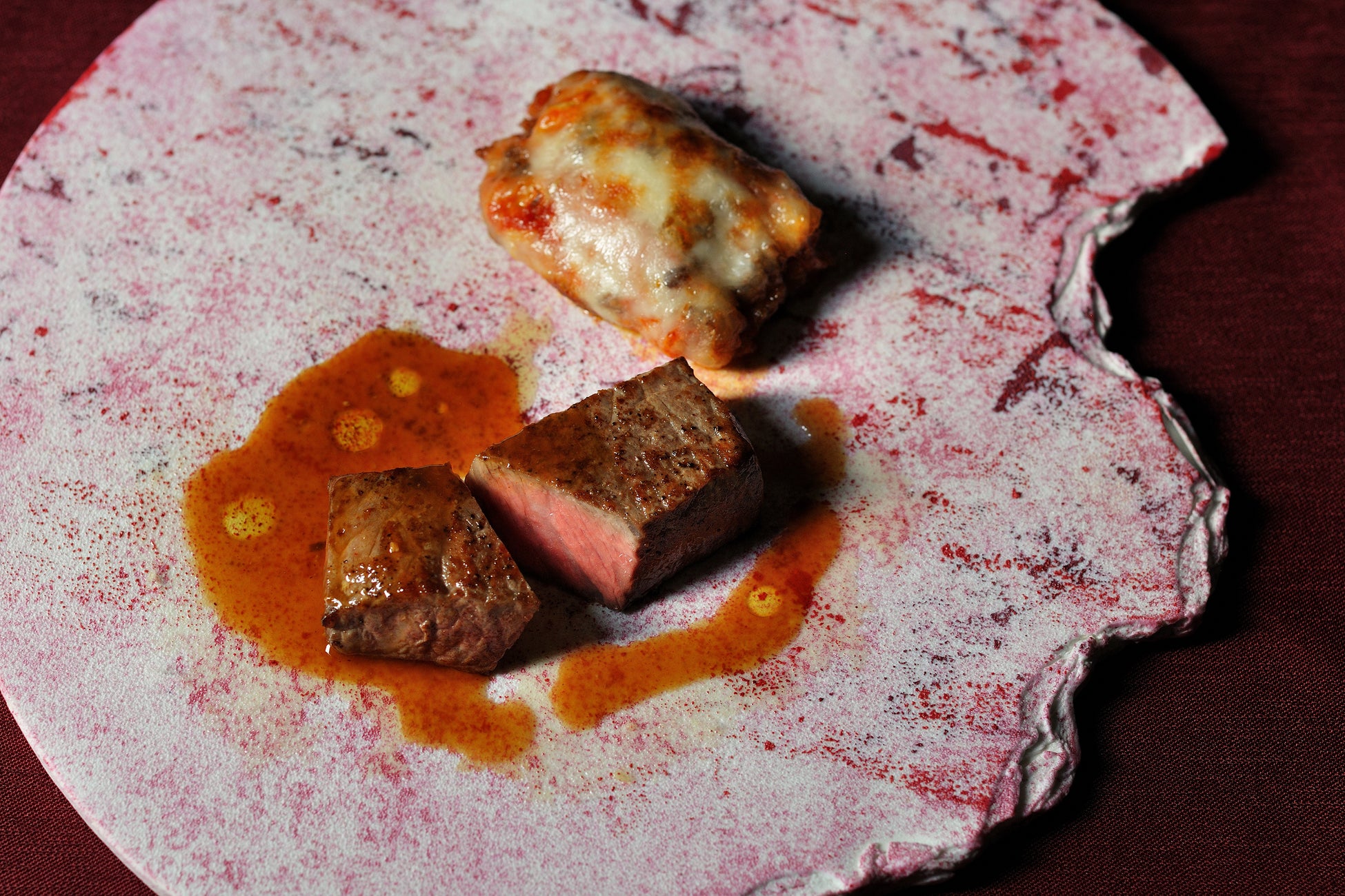 葡萄の枝でスモークし香ばしく焼き上げた牛肉は、うま味が凝縮され、噛むほどに味わいが広がります。ニラの香りを纏わせたソースがアクセントです。秋にうま味が増す茄子と、ワインパミス(*3)を使ったラザニアを添えて提供します。