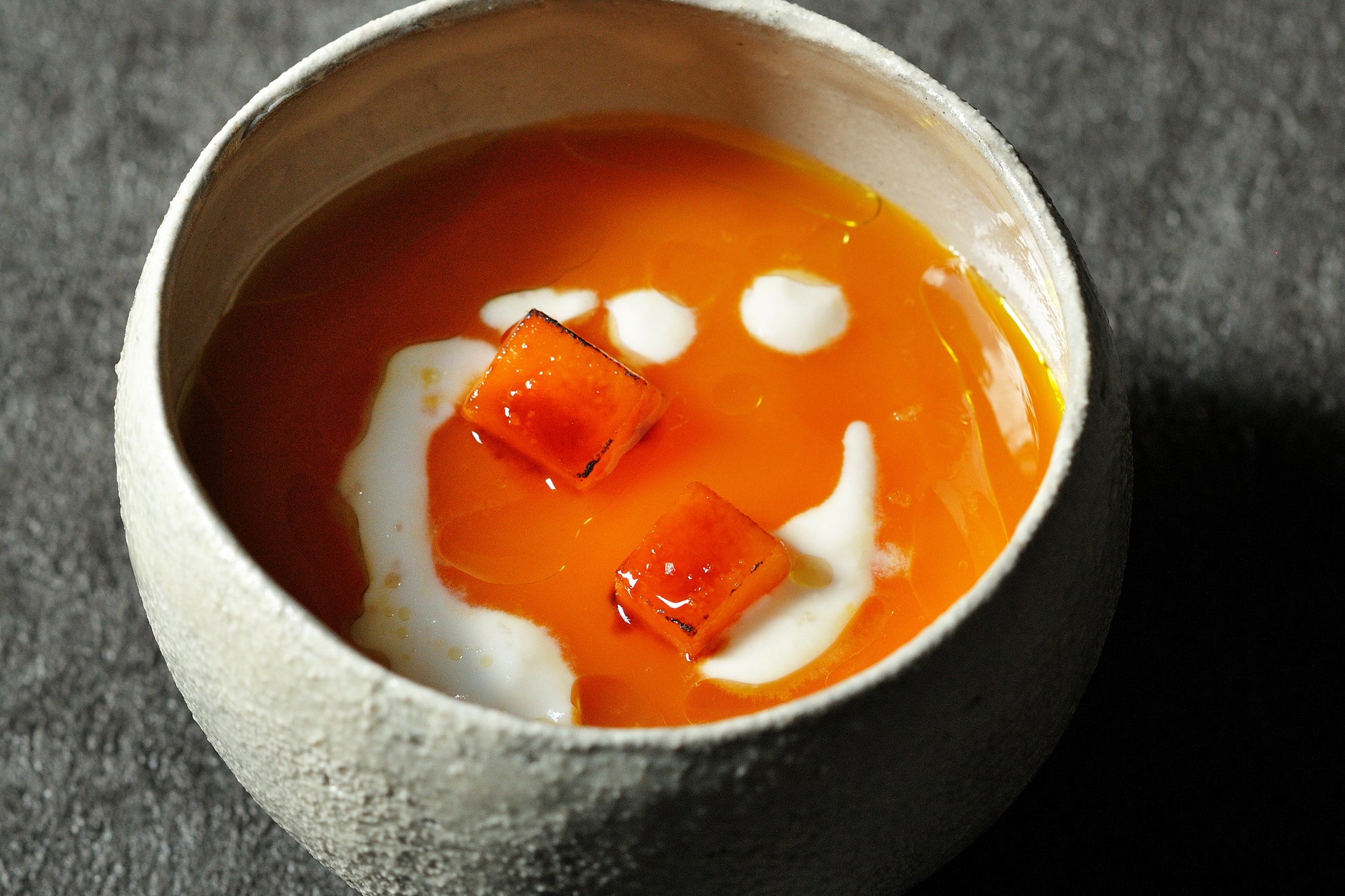 バターナッツの素材本来の濃厚な味わいを引き出すために、水だけで仕上げた軽やかなズッパ(*2)。クリーミーなリコッタチーズがアクセントの一皿です。
