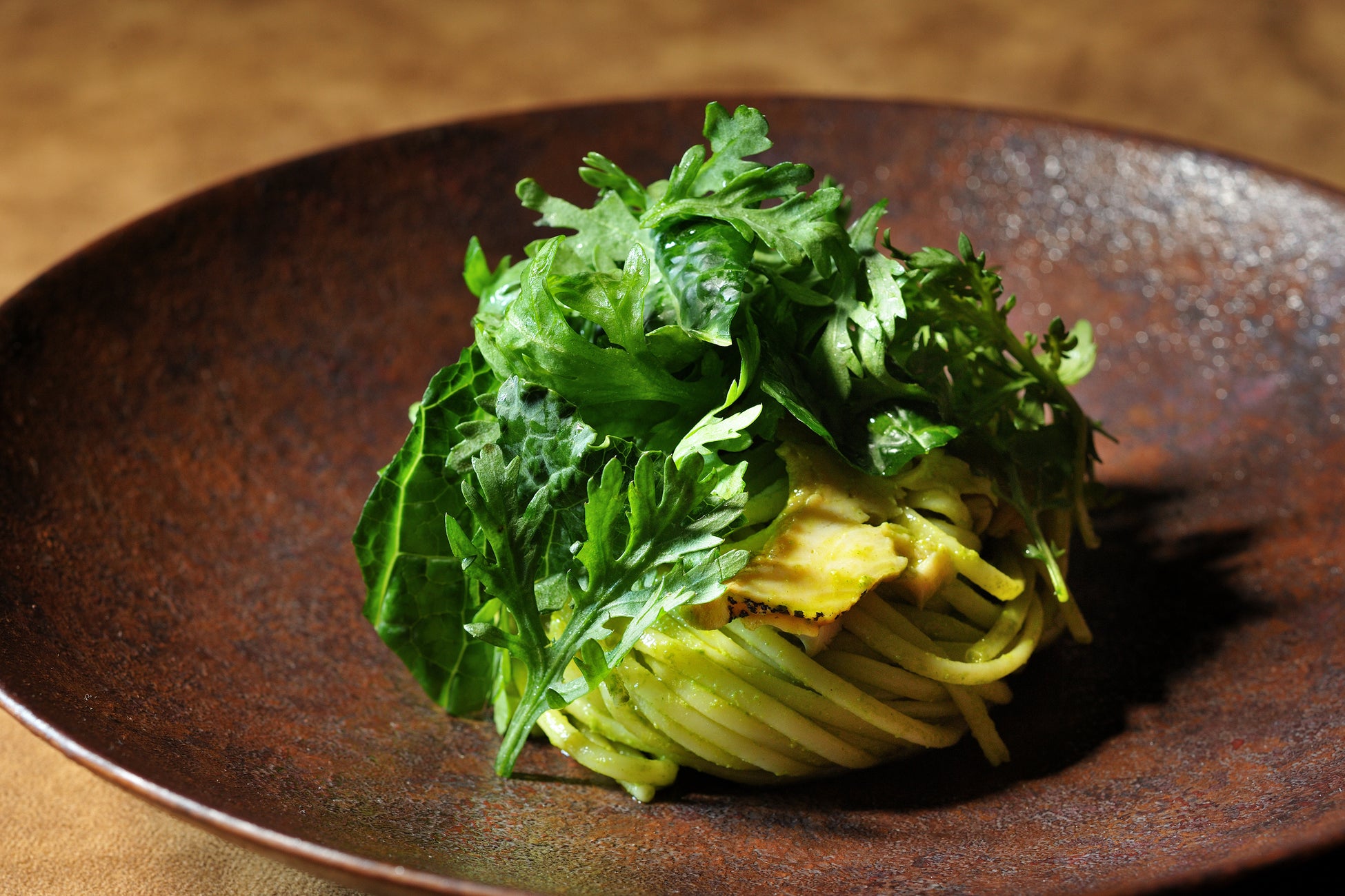 心地よい苦みが特徴の春菊とカーボロネロをジェノベーゼに仕立て、山梨の郷土料理である煮貝と合わせました。春菊とカーボロネロのしゃきしゃきとした食感を楽しめます。