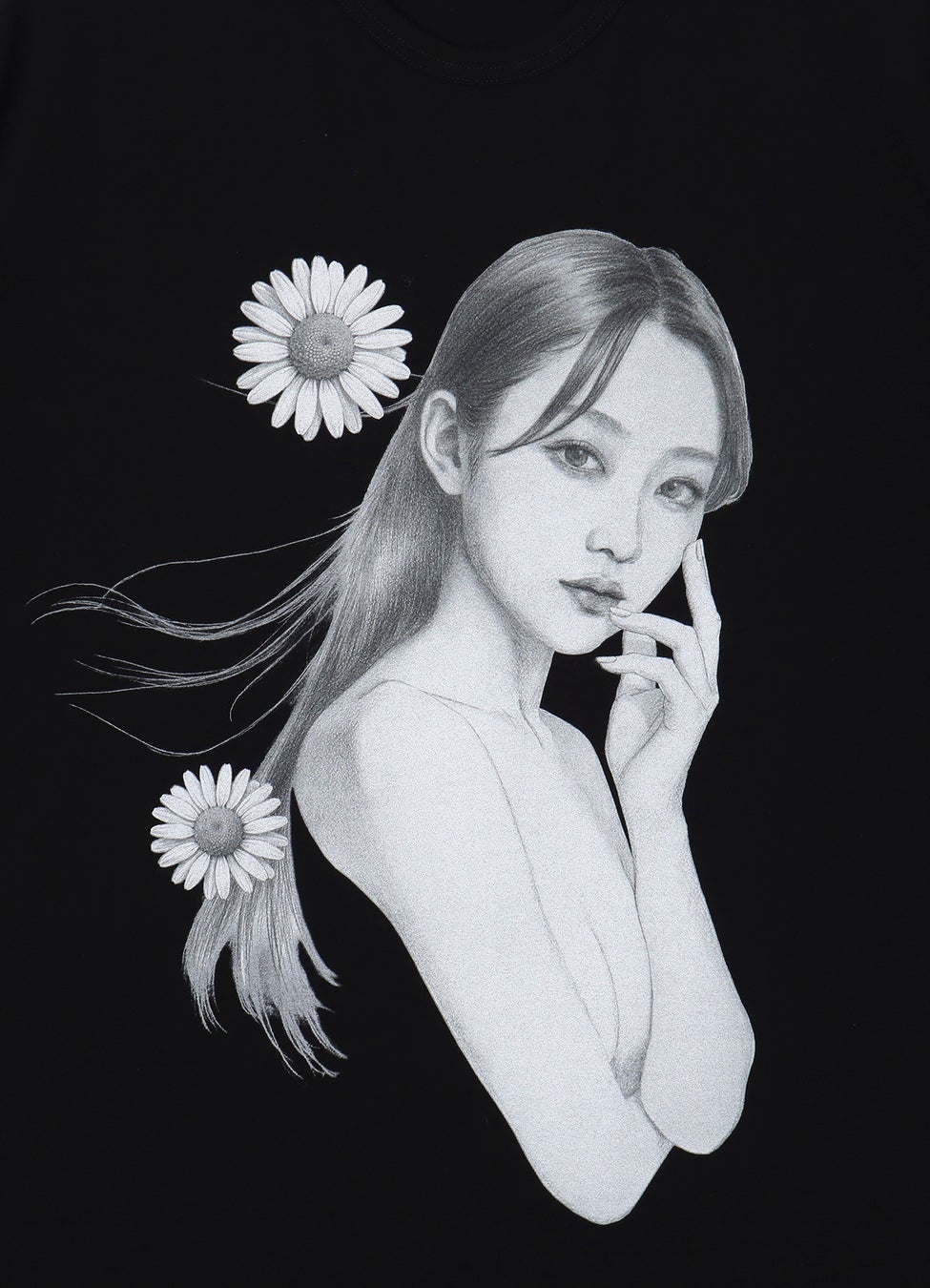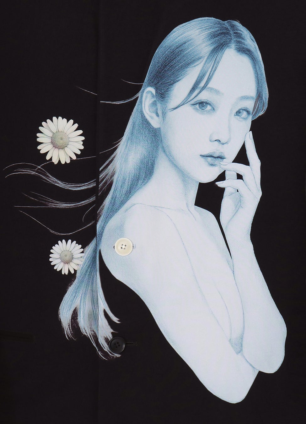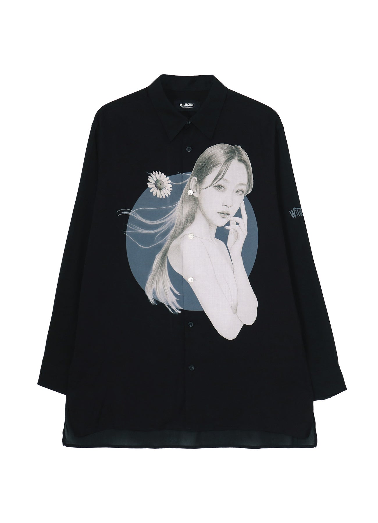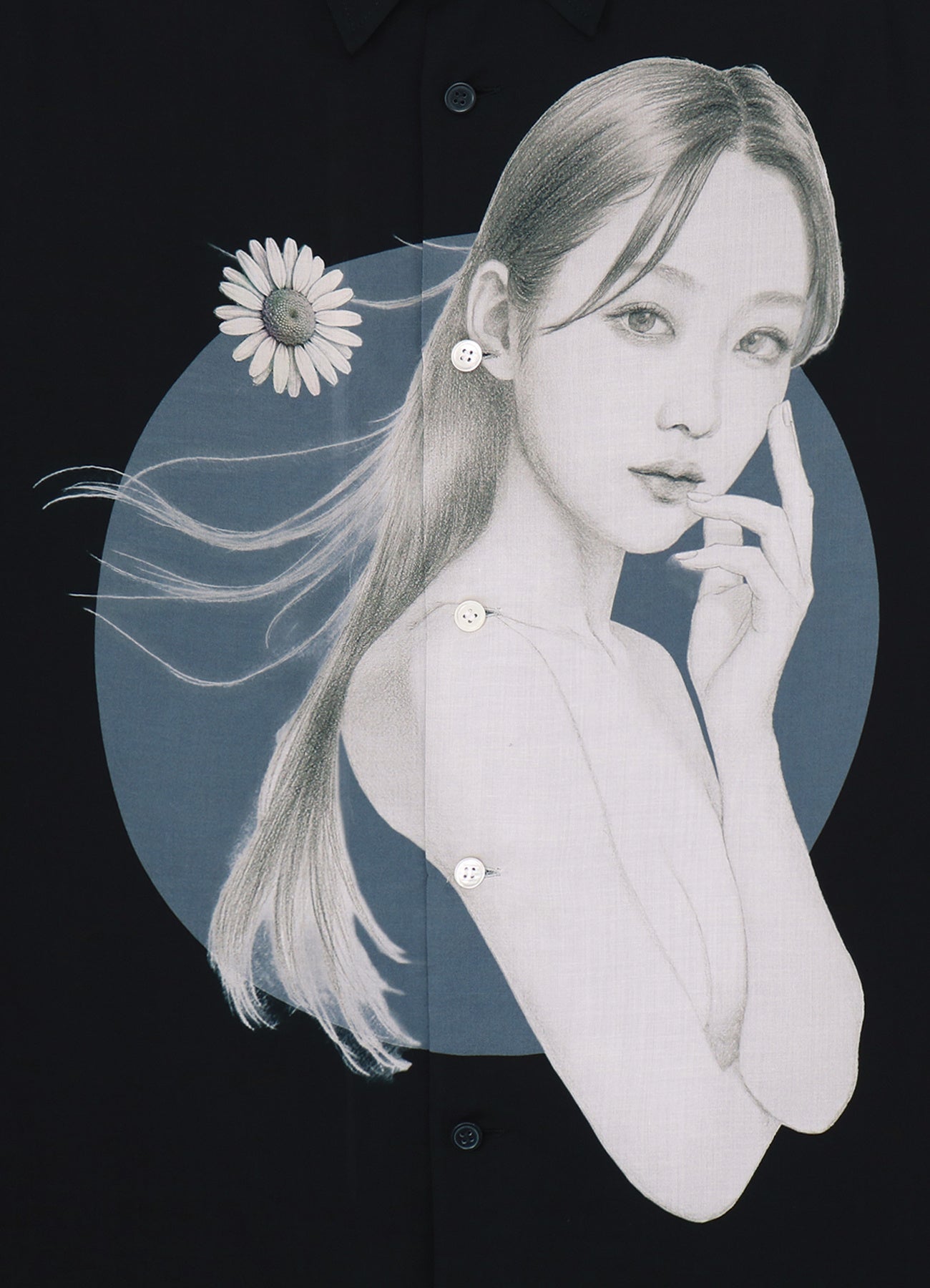 また、それぞれの素材の特性を活かしながら、「春の風」の世界観を落とし込み、マーガレットの花を配したジャケット、ブラウス、Tシャツの3型を展開。デシン素材のジャケットは軽やかでシワになりにくく、レーヨンのブラウスは柔らかなドレープが魅力。Tシャツはルーズシルエットで余白を持たせたフォルムに仕上げています。原画の質感や鉛筆のタッチまで繊細に再現し、絵の手触りまでも感じられるような繊細な表現が特徴です。プリント技法により生じる、ボディと人物の色彩コントラストにもご注目ください。