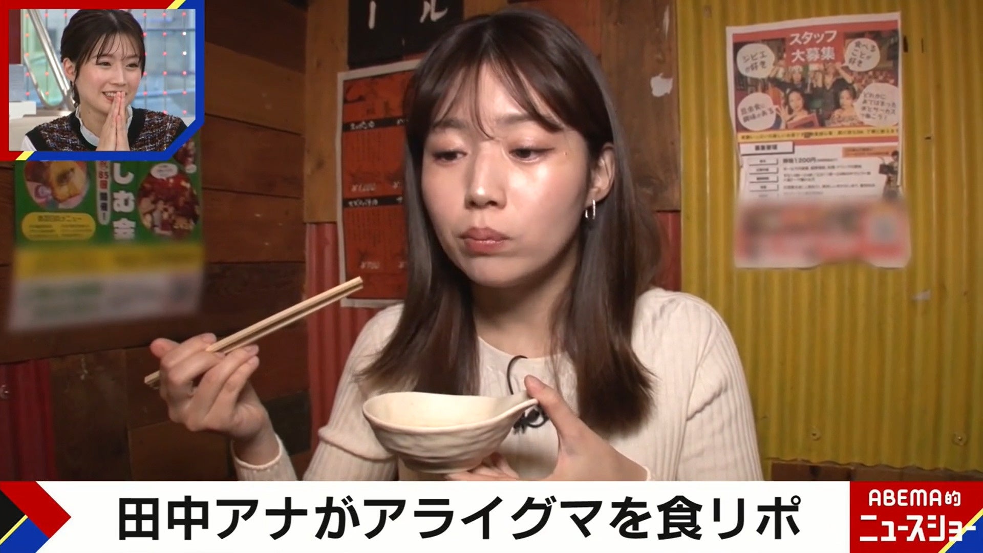 そんなアライグマをジビエ料理として提供している飲食店を、番組進行を務めるテレビ朝日の田中萌アナウンサーが取材しました。この店では、旨みの強さが特徴だとされるアライグマのもも肉を使用し、味噌ベースのスープで煮込んだ鍋料理として提供。田中アナは「まったく臭みがない!美味しいです」「食感は噛み応えのある牛肉で、脂身の感じは豚肉に近いかも」「味噌と合いますね」とリポートしました。