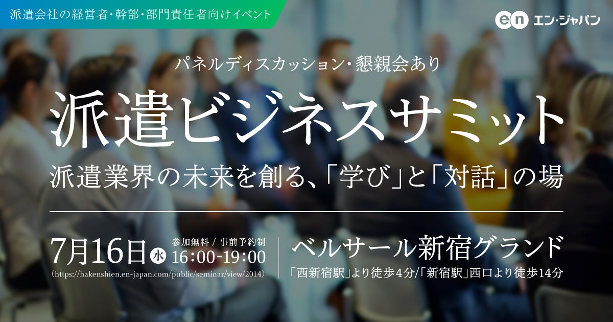 エン・ジャパン株式会社(本社:東京都新宿区、代表取締役会長兼社長:越智通勝)は、2025年7月16日(水)に派遣会社向けイベント『派遣ビジネスサミット』(https://hakenshien.en-japan.com/public/seminar/view/2014)をオフライン開催いたします。