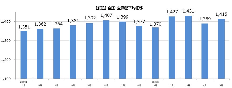 【派遣】全国・全職種平均時給は1,415円。前月比+26円。前年同月比+64円。